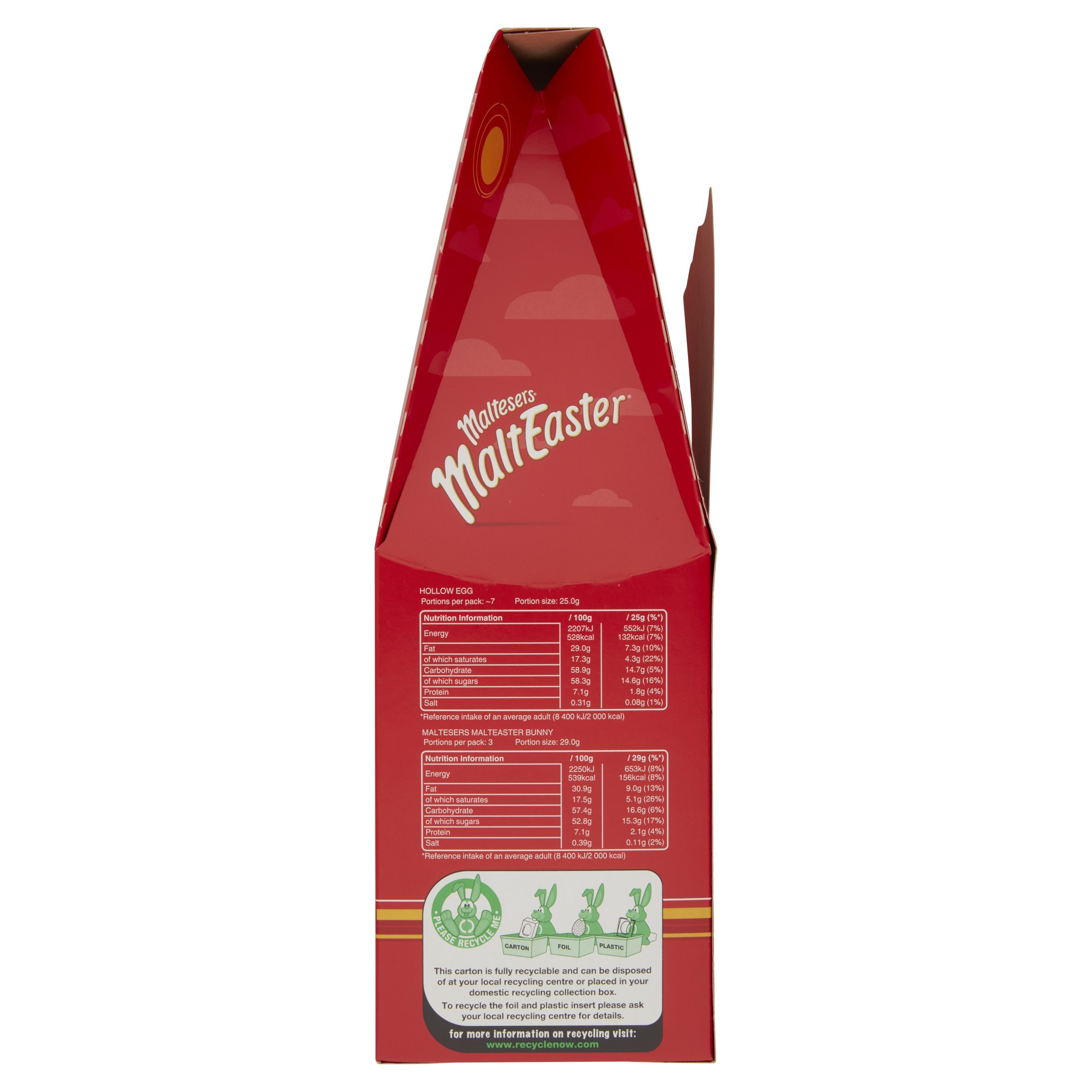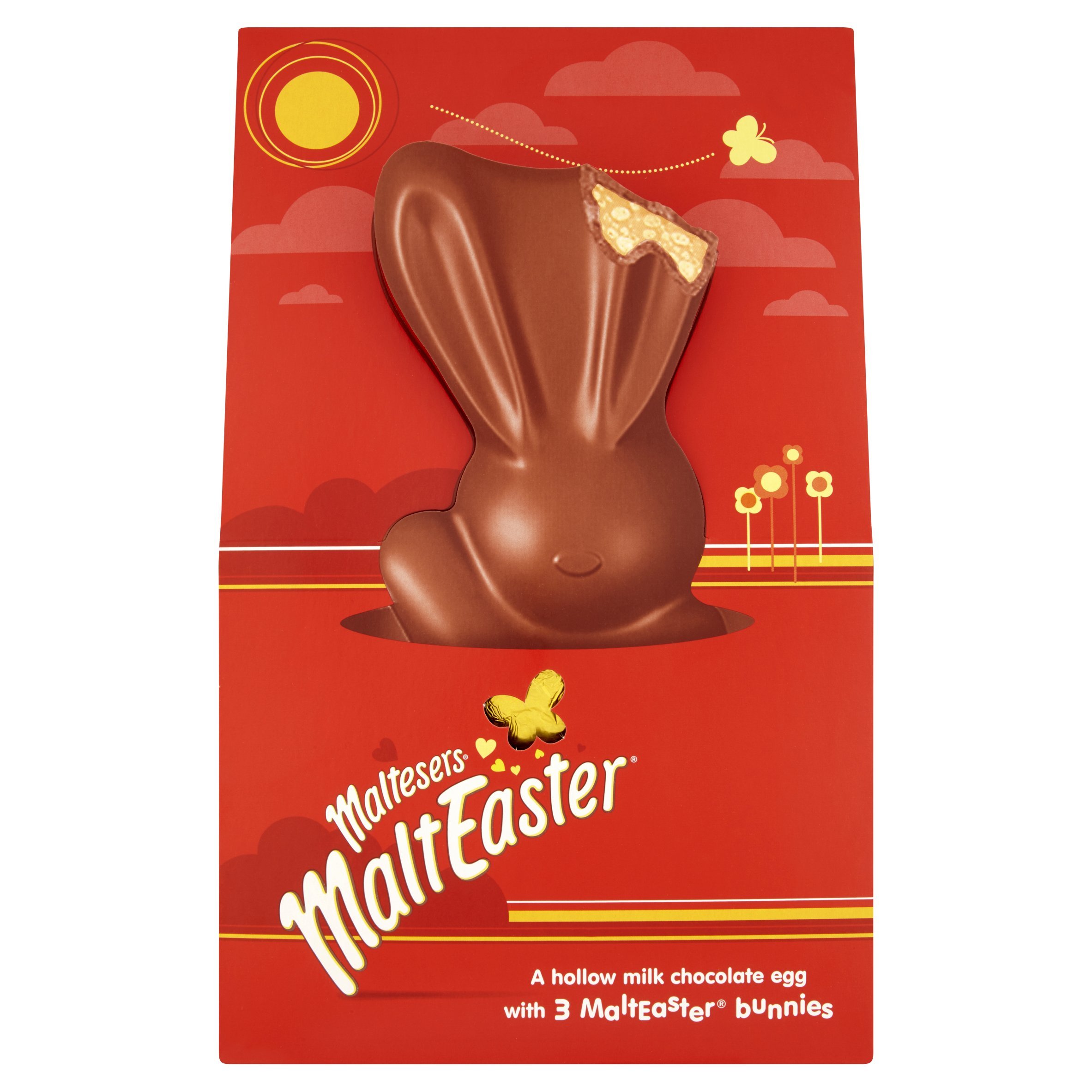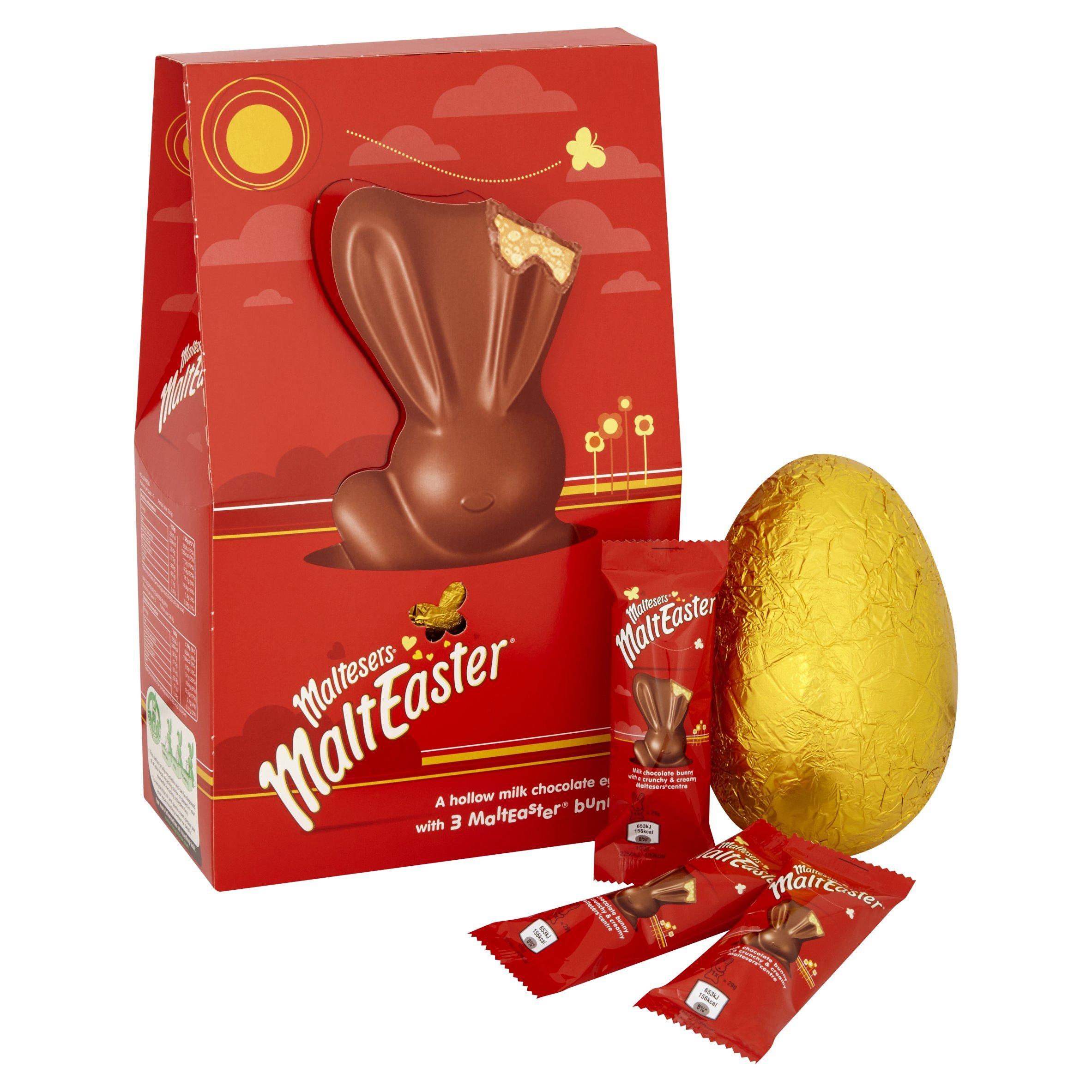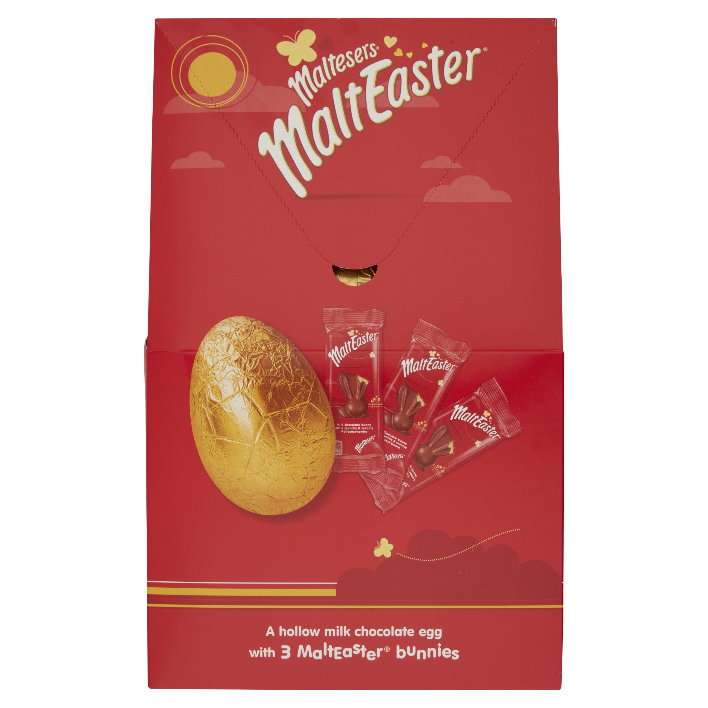 Each and every egg Comprises one hole milk chocolate egg and 3 29g Malteaster bunnies