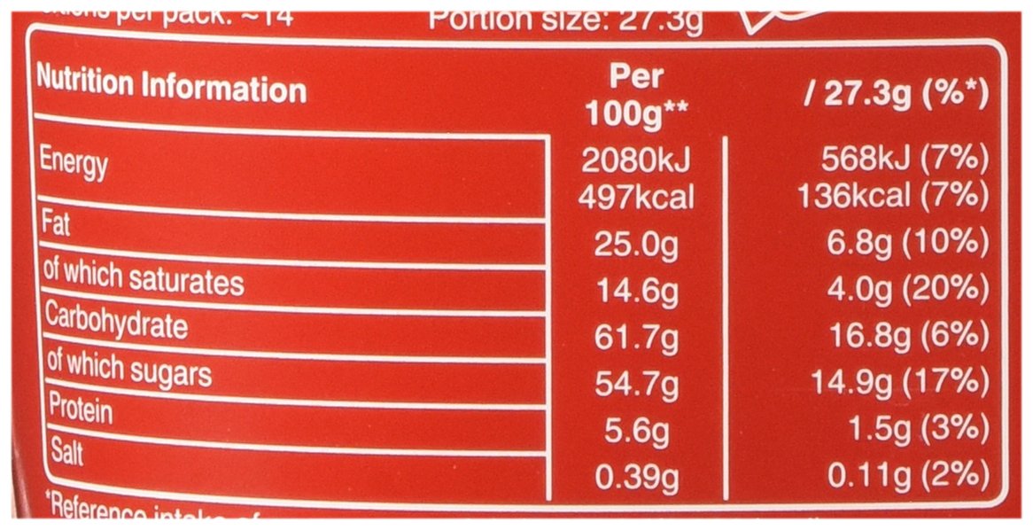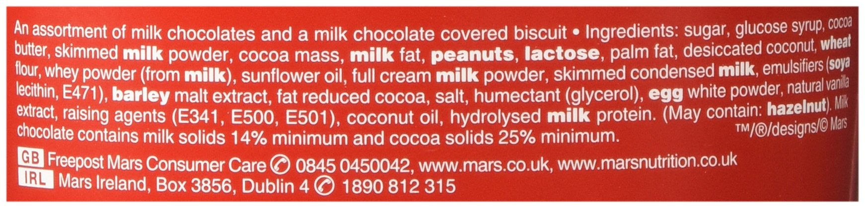 An Collection of milk chocolates and a milk chocolate lined biscuit. Collection: Snickers, Galaxy caramel, Galaxy, Twix, Mars, Milky Means, Teasers & Bounty Ingredients Sugar, Glucose Syrup, Cocoa Butter, Skimmed Milk Powder, Cocoa Mass, Milk Fat, Lactose, Palm Fat, Peanuts, Desiccated Coconut, Whey Powder (from Milk), Wheat Flour, Sunflower Oil, Full Cream Milk Powder, Emulsifiers (Soya Lecithin, E471), Barley Malt Extract, Fat Reduced Cocoa, Salt, Humectant (Glycerol), Egg White Powder, Natural Vanilla Extract, Raising Agents (E341, E500, E501), Milk Protein, Wheat Gluten,(would possibly include: Hazel nut Almond, Oats) Milk Chocolate Comprises Milk Solids 14% minimum and Cocoa Solids 25% minimum Nutrition Standard values Per 100g** Energy 2066kJ/493kcal Fat 24g Of which Saturates 15g Carbohydrate 62g Of which Sugars 56g Protein 5.4g Salt 0.39g **On Reasonable