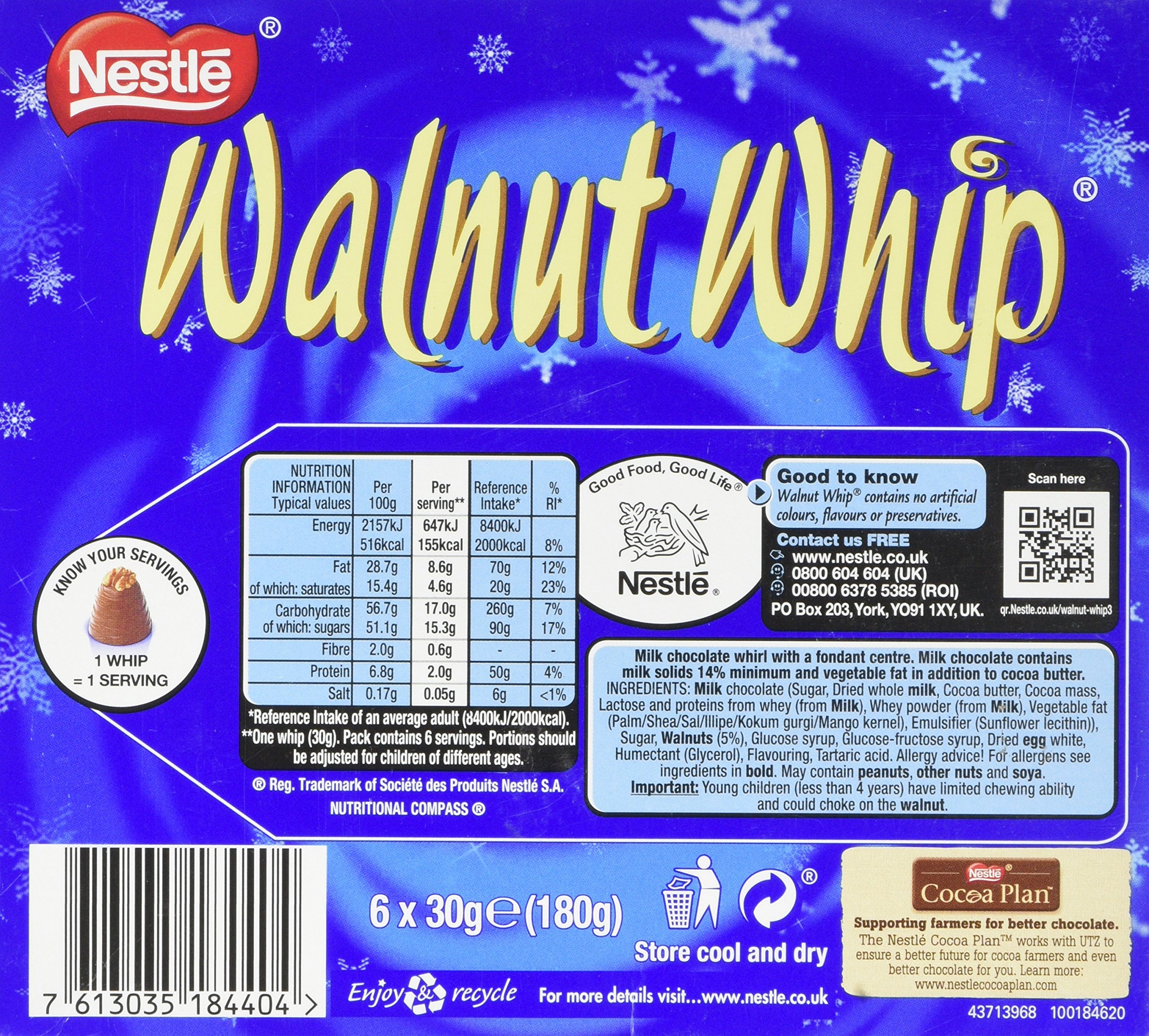At Nestle they use four simple words to describe what they offer: “Good Food Good Life”. Nestle imagine that having a healthy, balanced solution to the things you eat and drink lets you enjoy life. Nutrition is only one aspect of “Good Food Good Life”. Great taste, consistent levels of quality and safety, value for money and convenience also make stronger their enjoyment of food and in the end life. Walnut Whip’s are a delicious whirl-shaped cone of milk chocolate with a whipped vanilla fondant filling, topped with a half-walnut. Allergy Advice Might Contain Gluten, Might Contain Wheat, Comprises Eggs, Comprises Milk, Might Contain Nuts, Comprises Walnuts.
