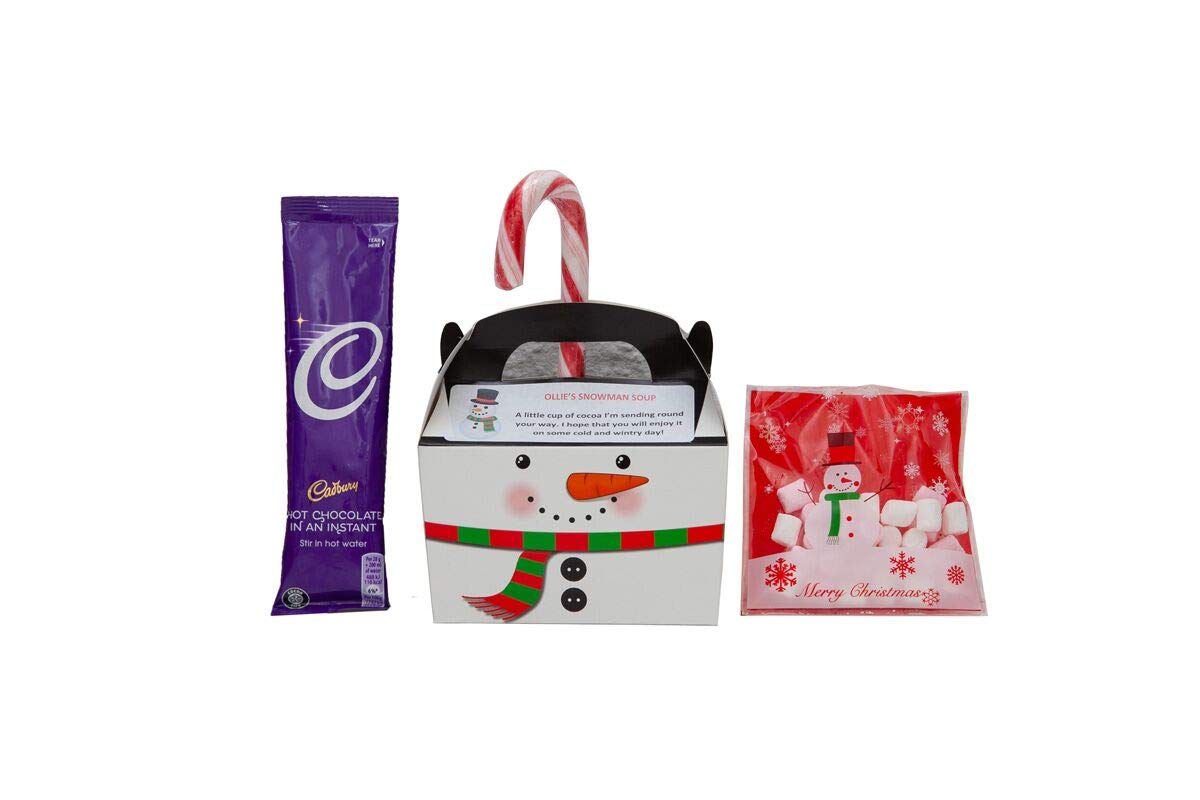 This pleasant reward/stocking filler will delight all. Perfect Christmas Eve Field filler. Set contains: Snowman Field with poem, Bag of mini marsh mallows, Huge 28g candy cane and 1 x Cadburys hot chocolate sachet. Comes flat packed however really easy to pop Field in combination.