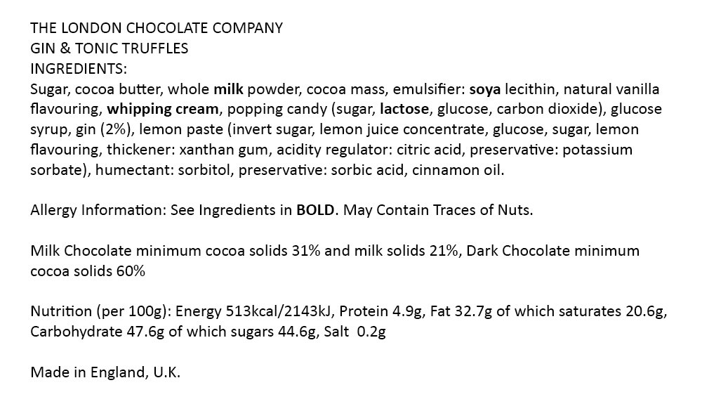 Artisan chocolate truffles with London Gin, popping candy and a dash of lemon and cinnamon. A delicious treat for a Gin enthusiast or somebody that appreciates fine chocolates. Our truffles are proudly made in London the use of carefully selected ingredients such as the premium white chocolate and London Gin utilized in these unique truffles. We added a little bit lemon and cinnamon to those, as do the world’s highest cocktail barista’s and chefs to a gin and tonic to lend a hand bring out the flavor of the gin.