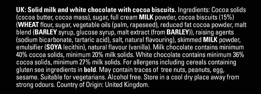 A swirling mass of milk and white chocolate with crunchy cocoa biscuits