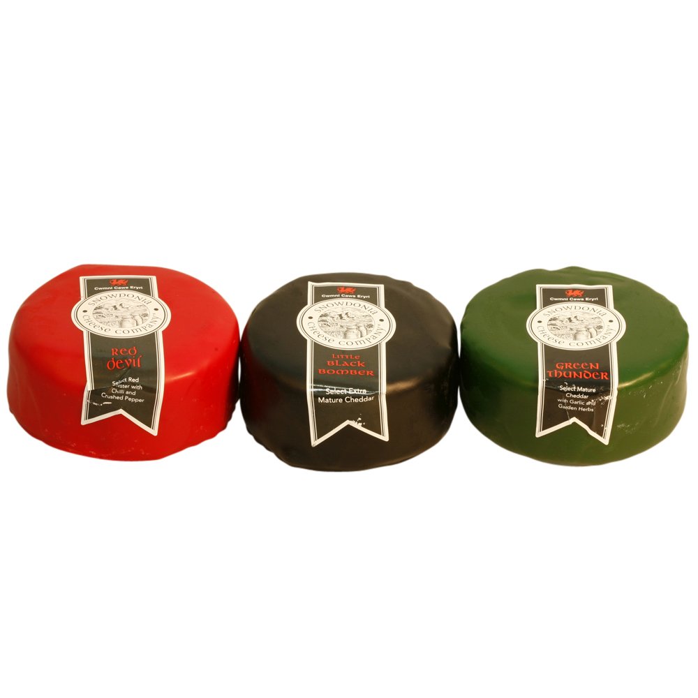 It is a trio of excellent, wax-encased Cheddar truckles. The Black Bomber is the signature extra mature Cheddar from Snowdonia Cheese Company.
