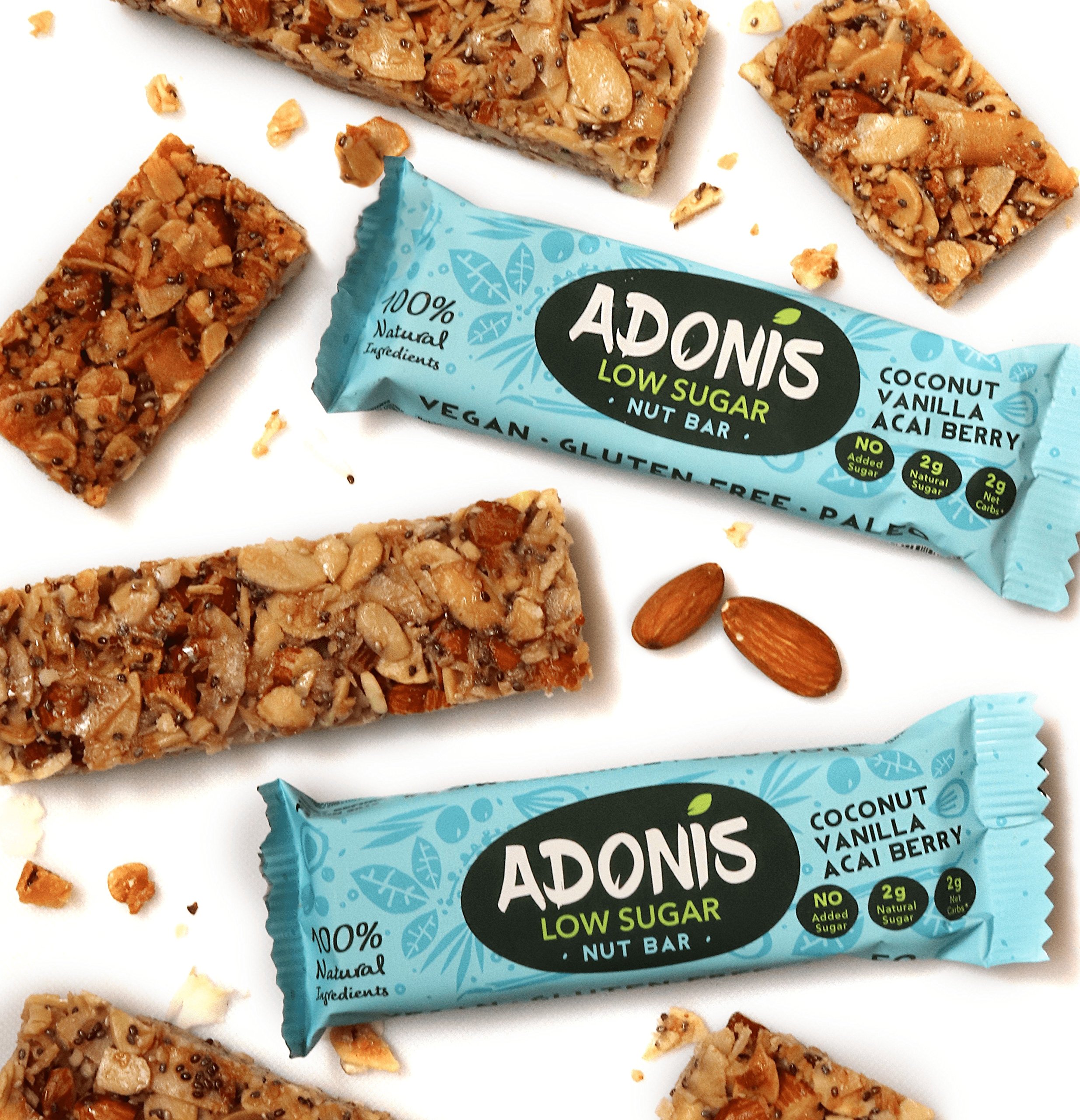 Meet our new crunchy vanilla nut bar! The rich combination of vanilla, coconut and acai berry will make you are feeling like exotic vacation even on a busy day. The low sugar revolution has begun! Adonis has created a range of low sugar snacks designed to be so low in sugar that they aim to not cause a blood sugar spike. They’ve between 1-2g of naturally occurring sugar, the usage of no refined sugar or fruit sugar either. With only 2g of affect carbs and are 100% natural, gluten free, vegan, soy free and are paleo. How we are different: Our low sugar content! Even if the various bars are natural and have no added sugar, they still have a high amount of fruit sugar such as dates. While these are great for doing sports and when you wish to have that fast release energy, we wish to be the option if you find yourself in the office, working late and need a slower release energy.