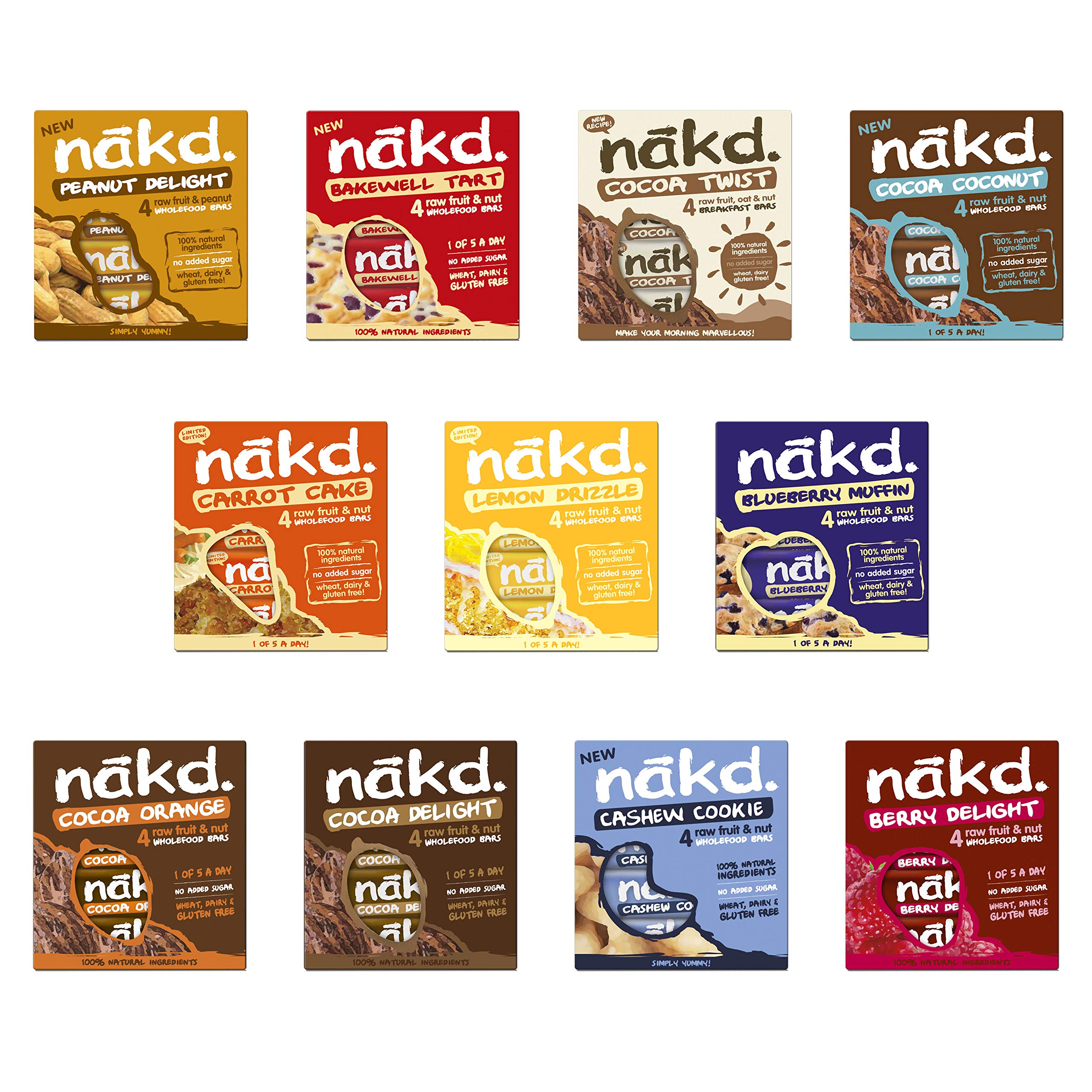 forty eight BARS 12 FLAVOURS ORIGINAL (four Bars every Flavour): Cocoa Satisfaction, Cocoa Orange, Cocoa Mint, Berry Satisfaction, Apple Pie, Strawberry Crunch, Cocoa Crunch, Rhubarb & Custard, Cashew Cookie, Banana Bread, Banana Crunch, Berry Cheeky. 48 BARS 12 FLAVOURS NEW (four Bars every Flavour): Bakewell Tart, Apple Crunch, Cocoa Loco, Cocoa Satisfaction, Cocoa Orange, Berry Satisfaction, Apple Pie, Strawberry Crunch, Cocoa Crunch, Rhubarb & Custard, Banana Bread, Banana Crunch. 44 BARS 11 FLAVOURS ORIGINAL (four Bars every Flavour): Cocoa Satisfaction, Cocoa Orange, Cocoa Mint, Berry Satisfaction, Apple Pie, Strawberry Crunch, Cocoa Crunch, Rhubarb & Custard, Cashew Cookie, Banana Bread, Banana Crunch. 44 BARS 11 FLAVOURS NEW (four Bars every Flavour): Bakewell Tart, Apple Crunch, Cocoa Satisfaction, Cocoa Orange, Berry Satisfaction, Apple Pie, Strawberry Crunch, Cocoa Crunch, Rhubarb & Custard, Banana Bread, Banana Crunch. 40 BARS 5 FLAVOURS CHOCOLATE LOVER (eight Bars every Flavour): Cocoa Loco, Cocoa Satisfaction, Cocoa Orange, Cocoa Crunch, Cocoa Mint. 44 BARS 11 FLAVOURS GLUTEN FREE (four Bars every Flavour): Apple Crunch, Bakewell Tart, Cocoa Satisfaction, Cocoa Orange, Cocoa Crunch, Cocoa Mint, Berry Satisfaction, Strawberry Crunch, Rhubarb & Custard, Cashew Cookie, Banana Crunch,