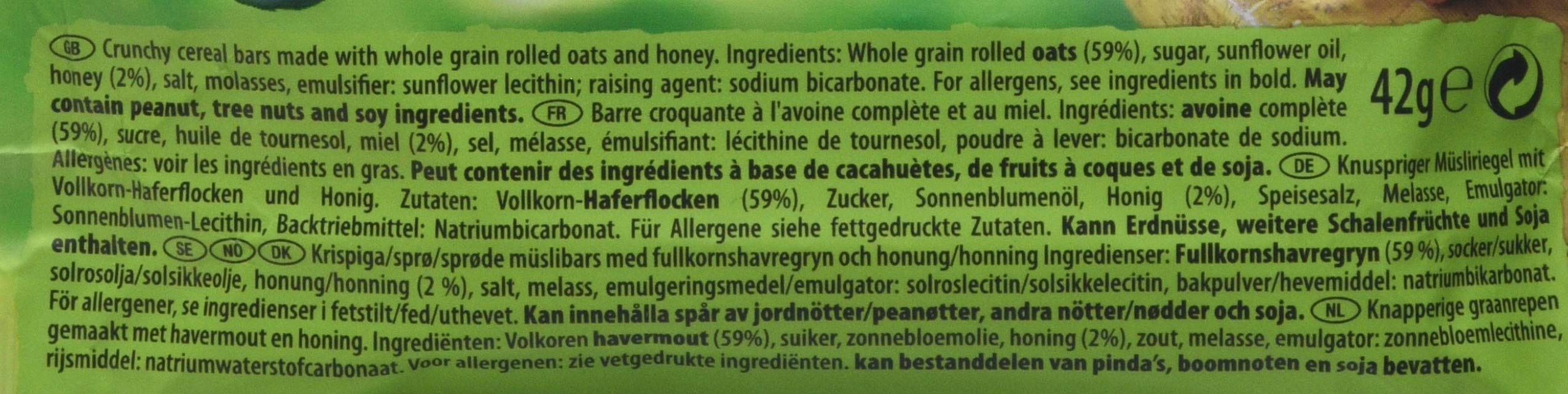Wholegrain rolled oats (59%), sugar, sunflower oil, honey (2%), salt, molasses, emulsifier: sunflower lecithin; raising agent: sodium bicarbonate. For allergens, see ingredients in bold. Would possibly contain peanut, tree nuts and soy ingredients.