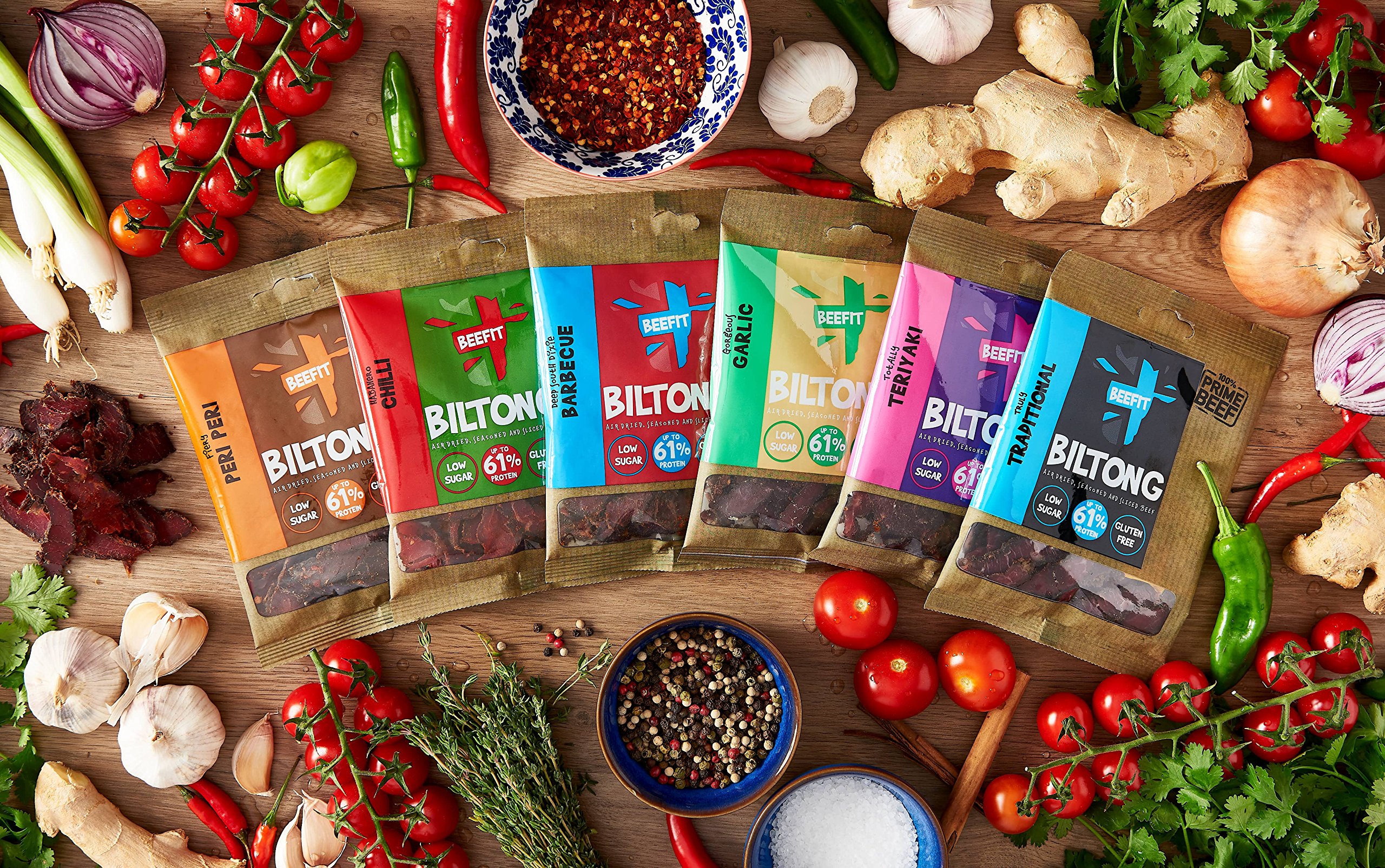 BEEFIT Snacks Flavour Fest Biltong. Each of Our Award Winning Beef Biltong. Beef Jerky. Traditional, BBQ, Chilli, Peri Peri, Garlic, Teriyaki.