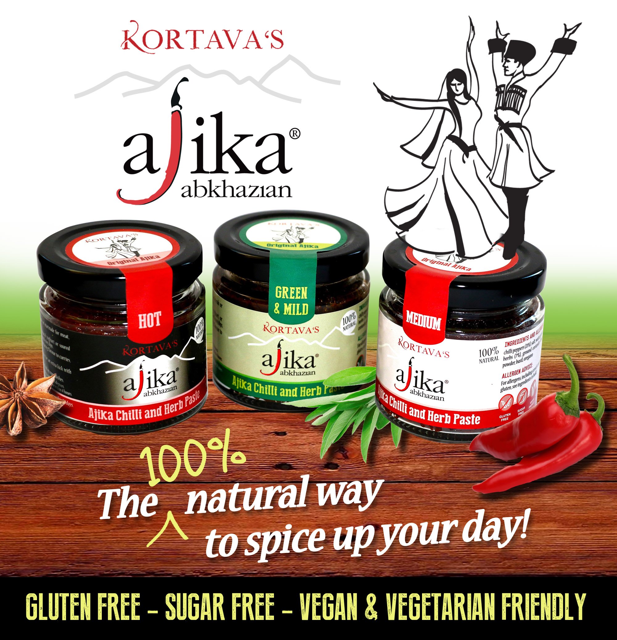 Ajika is an absolutely delicious cooking and ready-to-eat spicy paste with flavours unlike any other chilli product available on the market today. each jar is bursting with unique flavours and aromas all lovingly handmade to capture the authentic taste of their unique Caucasian heritage. For individuals who have travelled to the mountains of the Caucasus and brought kilograms of Ajika all-purpose spice pastes back home with them, they have long-awaited this wonderful chilli product to be available in the UK. Now, they are fast becoming a valuable store-cupboard ingredient For individuals who have tasted them. Their broad savoury flavours mean that Ajika can be utilized for all types of cuisines, and the best thing is that a little bit goes a long way to make any snack or dish in reality magical. Try them as spicy rubs and marinades with chicken, lamb, steaks, meat, pork and fish. Enjoy on sandwiches, with vegetables, in salads and combined with natural yoghurt, cream cheese, soured cream and hummus to make some quick and easy delicious dips and spreads. Try infusing sausage meat and burgers with the instant flavours and manageable heat of Ajika to make your cooking simply sublime. A great ingredient for any BBQ meal. Intensify curries, stews, pasta sauces and soups with rich bursts of flavours by adding just a small amount of any of the Ajika pastes in the range. From mild to hot, there is a heat strength and variation on flavours to satisfy any chilli-lover or avid foodie in search of that special ingredient to enrich their home cooking. AJIKA MAKES EVERYTHING TASTE GOOD! The use of only 100% natural ingredients and fragrant spice blends, Ajika is without doubt one of the most aromatic and tastiest spice combinations on offer today, and their versatility makes them invaluable. The plant based ingredients makes them perfect for vegan diets and having no oil or sugar means they are able to be used as part of a low-fat diet. They are also gluten and allergen free.