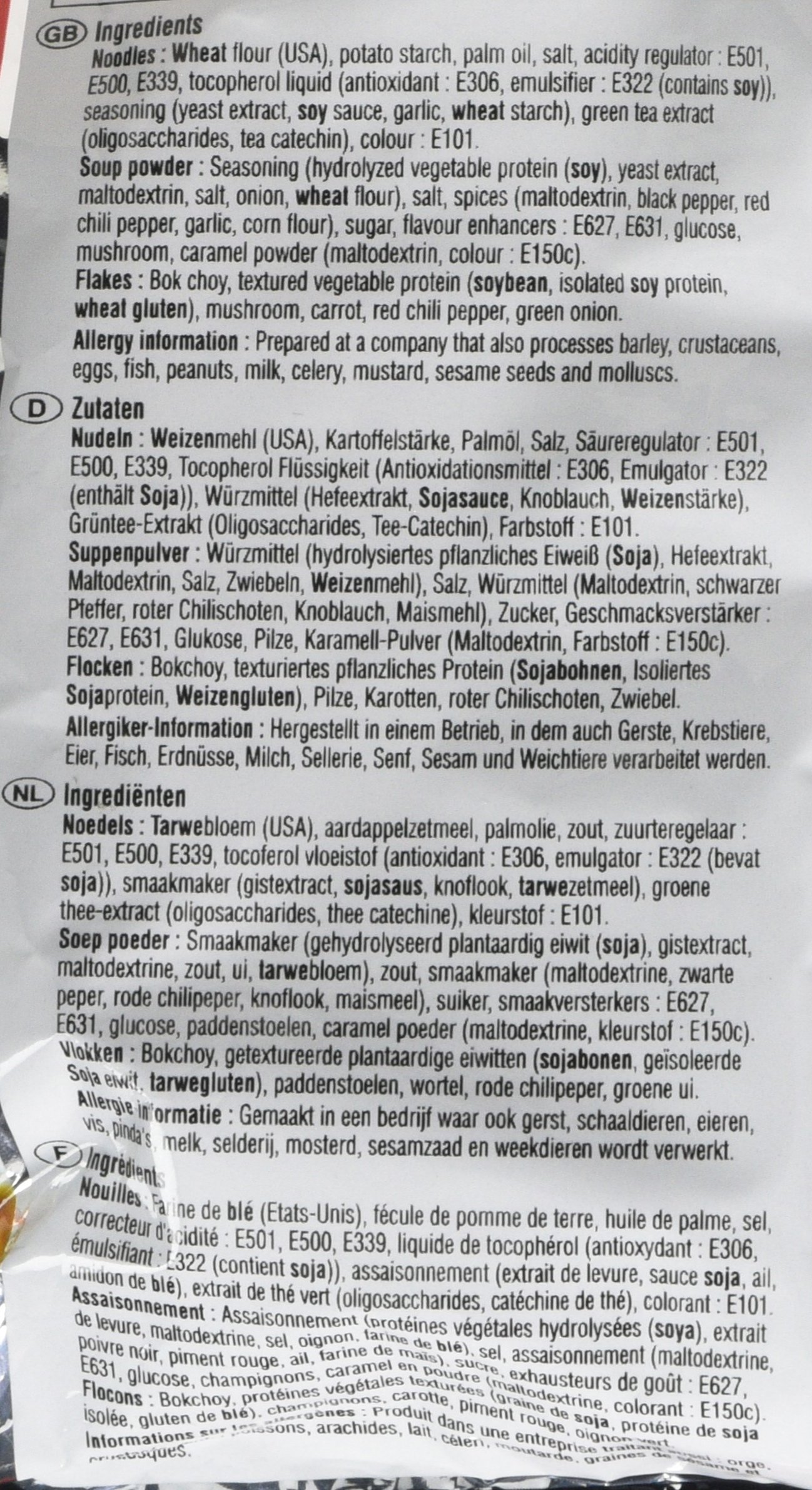 Ingredients: Noodles (Wheat Flour, Palm Oil, Potato Starch, Salt)Soup Powder (Salt, Purple Pepper, Garlic, Black Pepper, Onion Sugar, Soy Bean Paste Powder) Vegetable Powder (Dried Inexperienced Onion, Dried Carrot, Dried Mushroom, Dried Purple Pepper)Powder, Flavour Enhancers E621, E627, E631, Soy Sauce Powder.