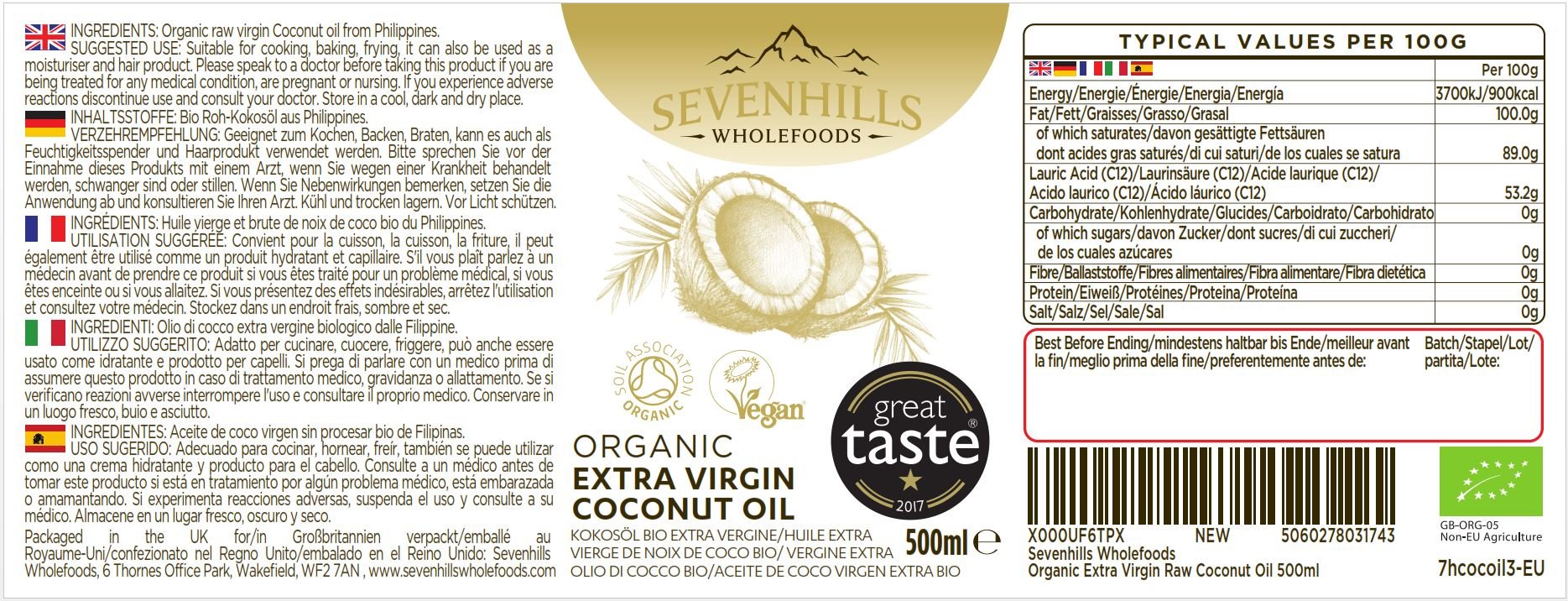 Organic Extra Virgin Raw Coconut Oil (cold-pressed) 500ml plastic tub. Coconut Oil is the really useful fat from the coconut. Grinding coconut meat produces coconut milk, from which the oil is extracted. Sevenhills Wholefoods’ coconut oil is sourced from the Philippines, which has the ideal conditions for coconuts to flourish, in tropical, coastal areas with high temperatures and humidity levels.