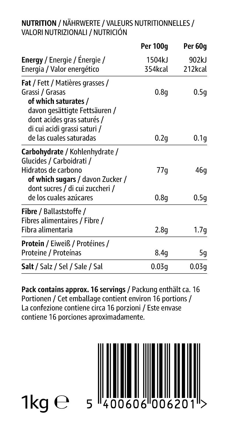 Nutritional values (per 100g): Energy = 354 kcal; Carbohydrate 77g; Protein 8.4g
