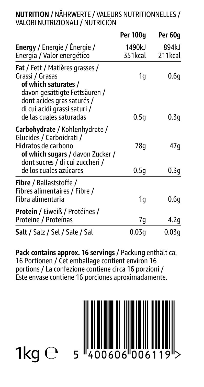 Nutritional values (per 100g): Energy = 351 kcal; Carbohydrate 78g; Protein 7g
