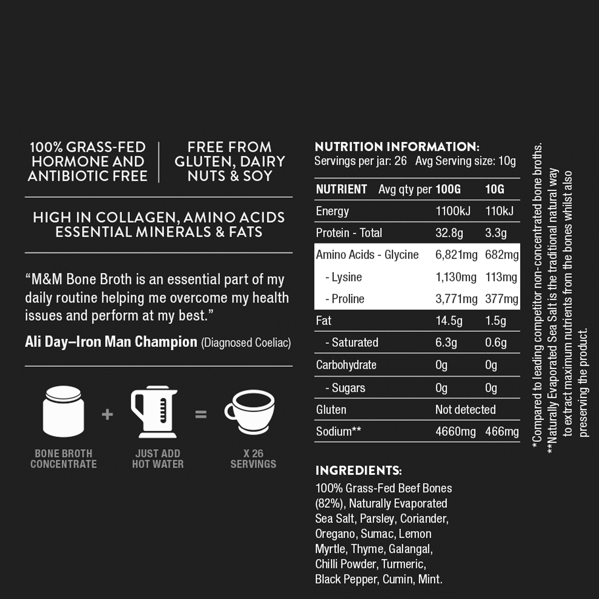 The World’s Most Nutrient Dense Bone Broth. Each gram of our proprietary Bone Broth Concentrate contains 10xMore collagen based amino acids than market leading traditional bone broths (Independent lab certified) We offer Value + Convenience. One Jar = 26 cups /serves. Adding Bone Broth to your diet has never been easier. Just one jar conveniently makes 26 cups of nutrient rich Bone Broth. Simply add one teaspoon to a cup of hot water, stir and enjoy. 100% Australian Grass-Fed (and finished) pasture raised, hormone and antibiotic free cattle from farmers that we know, and believe have been sourced. Traditional beginnings for the bone broth making process. The usage of only the bones proven to release the highest amounts of collagen based amino acids. We make large batches of traditionally slow simmered bone broth. Then to overcome our modern world environment we take the ancient wisdom and add in a proprietary process to increase the collagen based amino acid density to be 10x that of any traditional market leading Bone Broth. Our Bone Broth Range includes a Culinary and Performance range. The Culinary range Including the Natural, Curry and Lemon & Herb Range. The unique non-beefy flavour and paste-like consistency is perfect for stirring into almost any meal even as cooking, infusing nutrients into any standard dinner even as enhancing flavours like a restaurant quality stock. The Performance Range including AM Cleanse, Populate, Burn and Boost. They are formulated with functional ingredients that deliver specific benefits that will help you reach your personal goals. Ingredients: 100% Australian Grass-Fed Hormone and Antibiotic Free Beef Bones, Naturally Evaporated Sea Salt. Serving Suggestions: Instant – add one tsp to a cup of hot water and flavour as desired. Cooking- Stir through your favourite dish to boost nutritional benefits and flavour. Hot filled and pressured sealed to naturally extend shelf life to 12 months. Refrigerate once open and consume within 4 weeks.