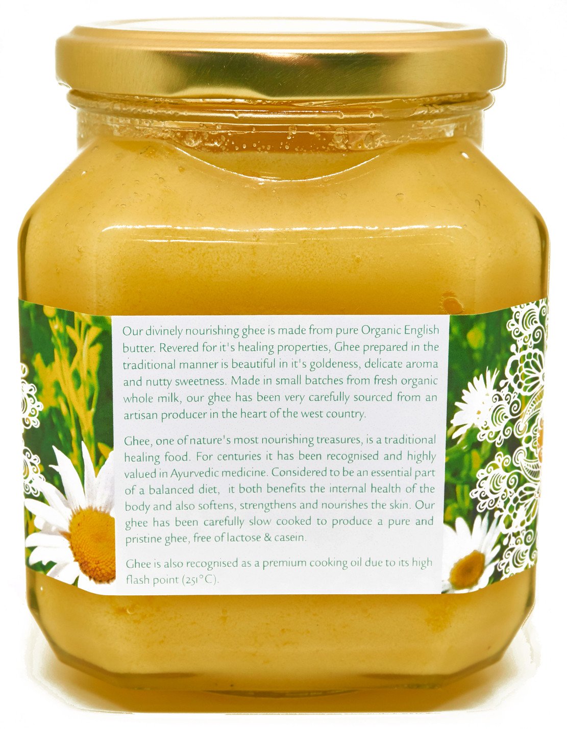 Ghee, one of nature’s most nourishing treasures, is a traditional healing food. For centuries has been recognised and highly valued in Ayurvedic medicine. Thought to be to be an essential a part of a balanced diet, it both benefits the internal health of the body and also softens, strengthens and nourishes the skin. Our ghee is carefully slow cooked to produce a pure ghee, free of lactose & casein.