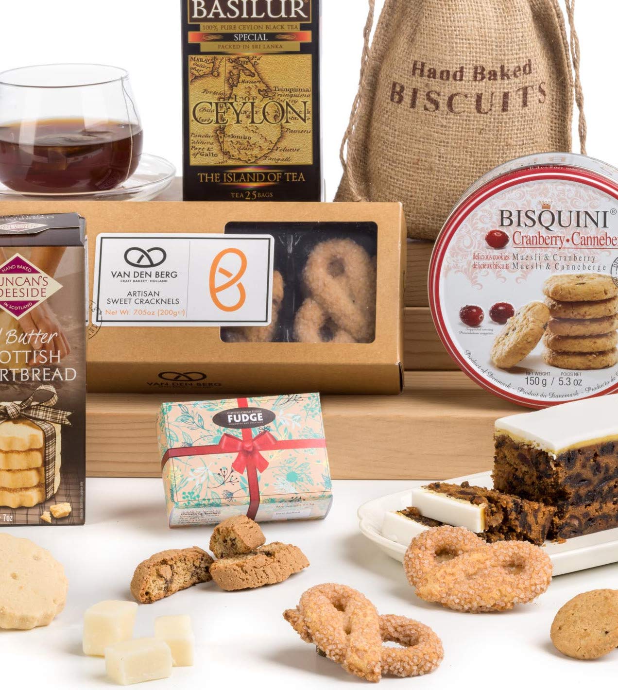 An assortment of melt within the mouth all butter shortbread, large sugar crusted pretzel shapes cookies, a tin of cranberry biscuits, twice baked chocolate chip biscotti bites, handmade clotted cream fudge and a fruit cake with Black Ceylon Tea