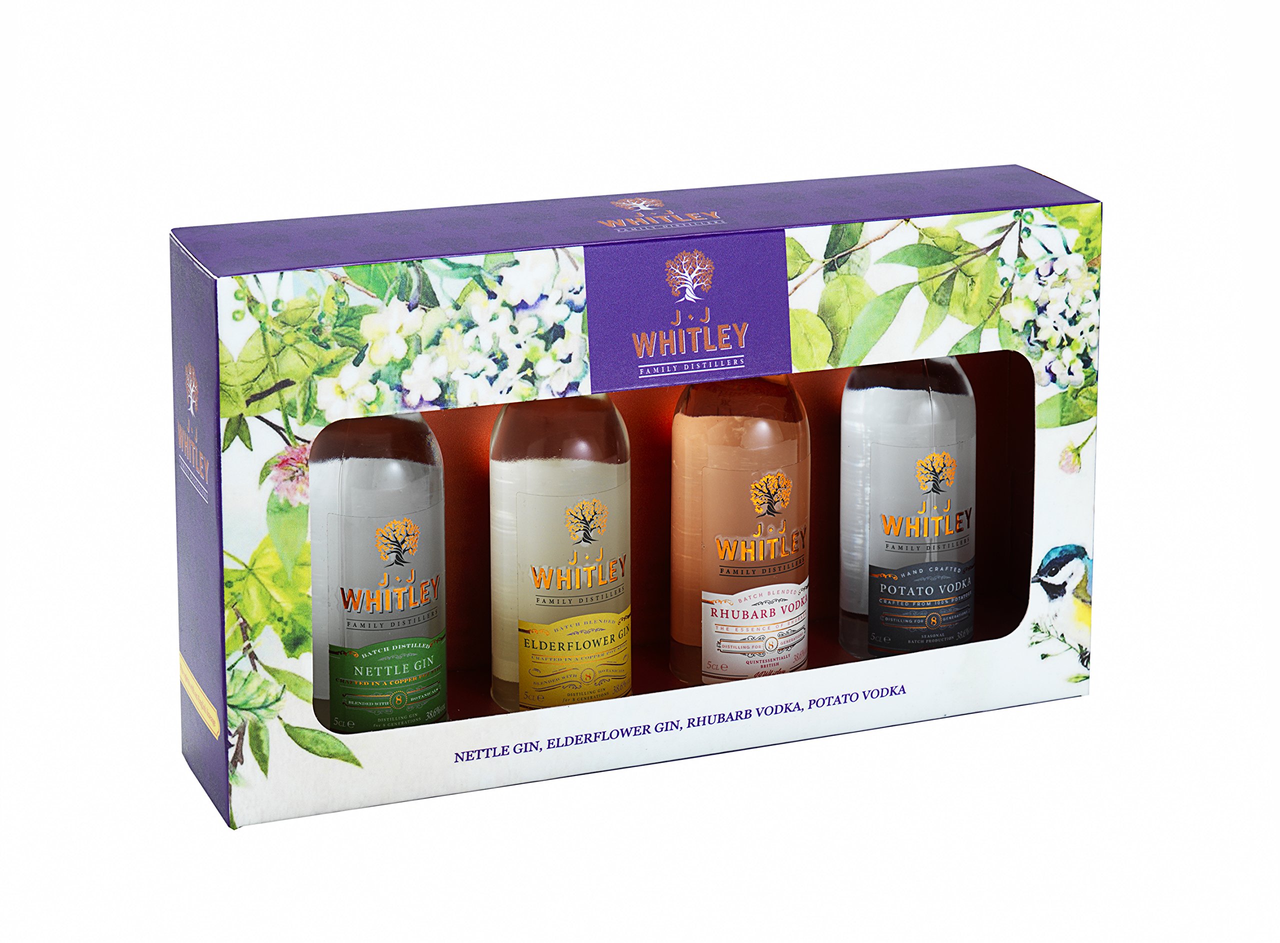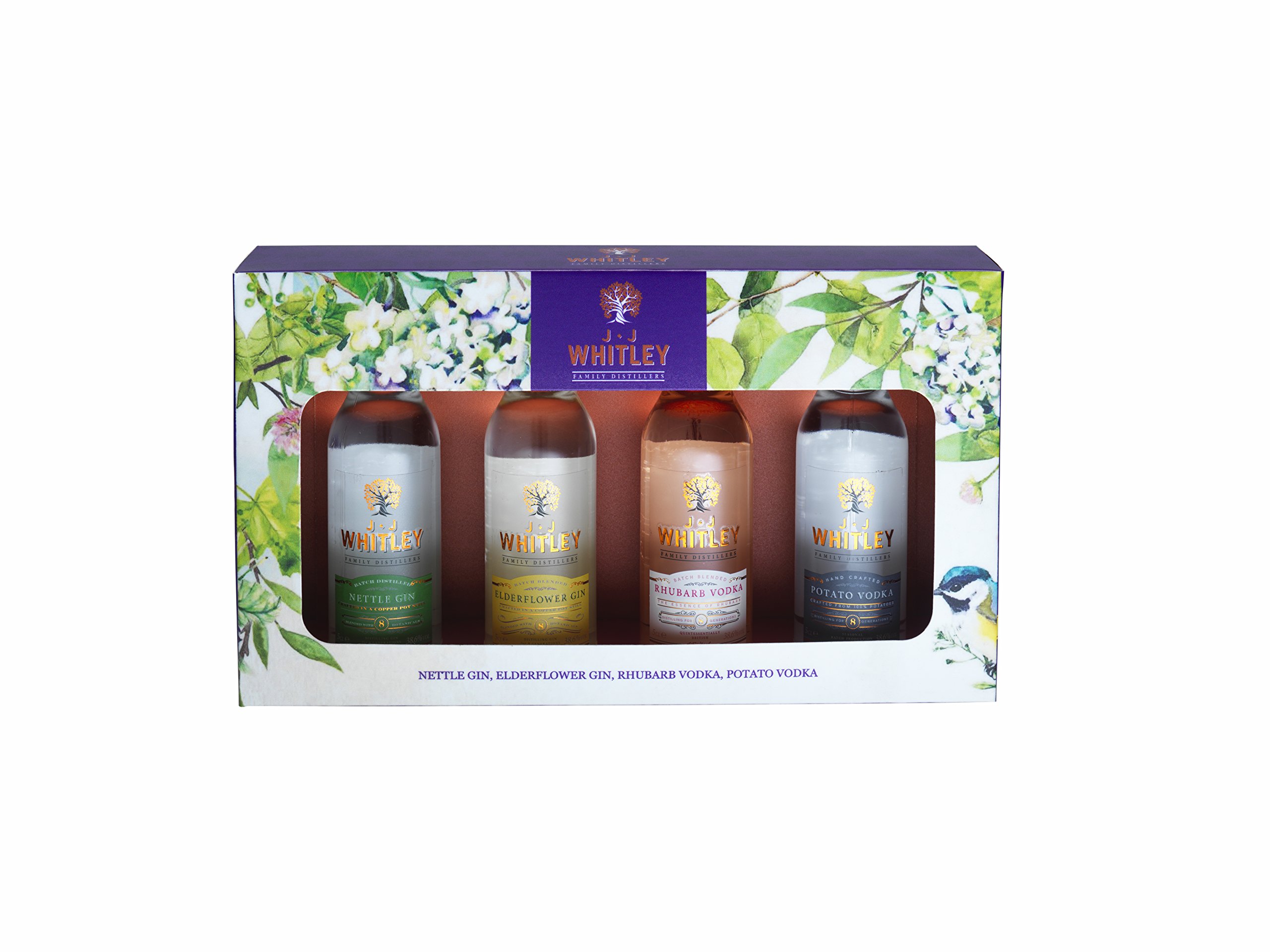 JJ Whitley Gift Set comprises Elderflower Gin, Nettle Gin, Potato Vodka and Rhubarb Vodka for that best possible gift pack or sharing pack.
