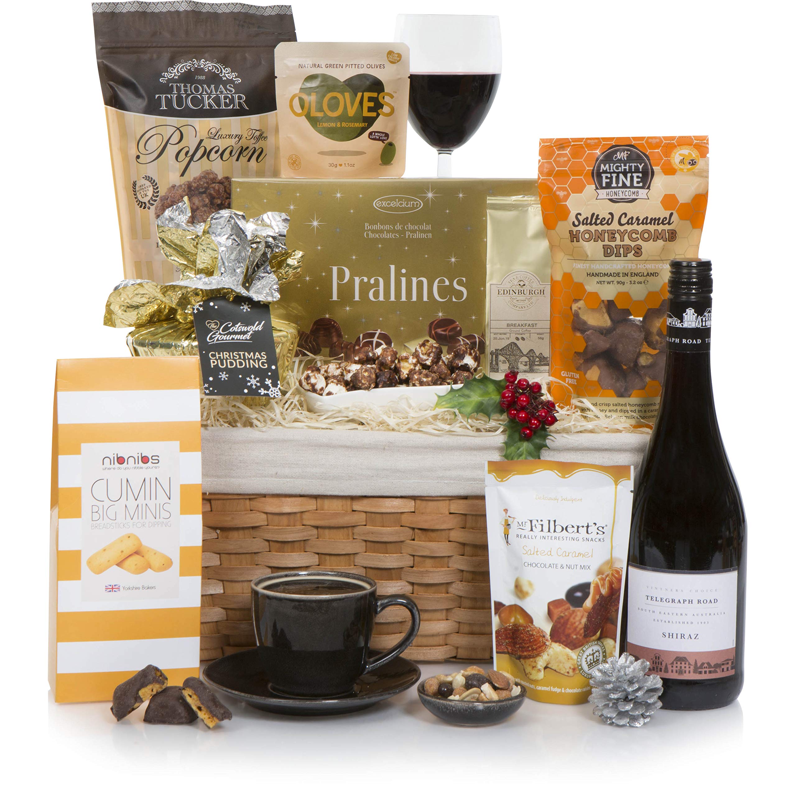 MAKES THE PERFECT GIFT – Crammed stuffed with food drink and presented in An improbable open wicker basket