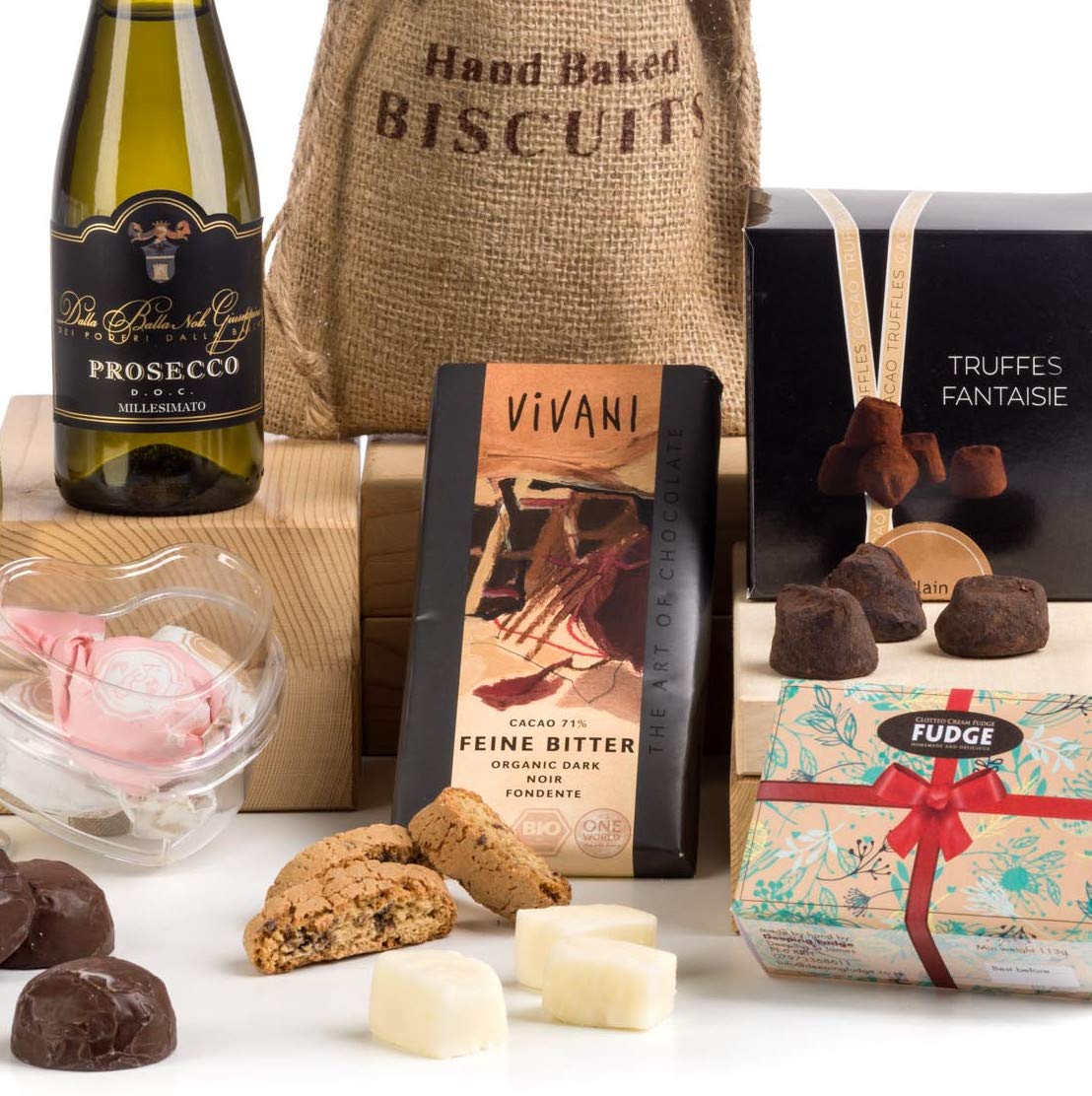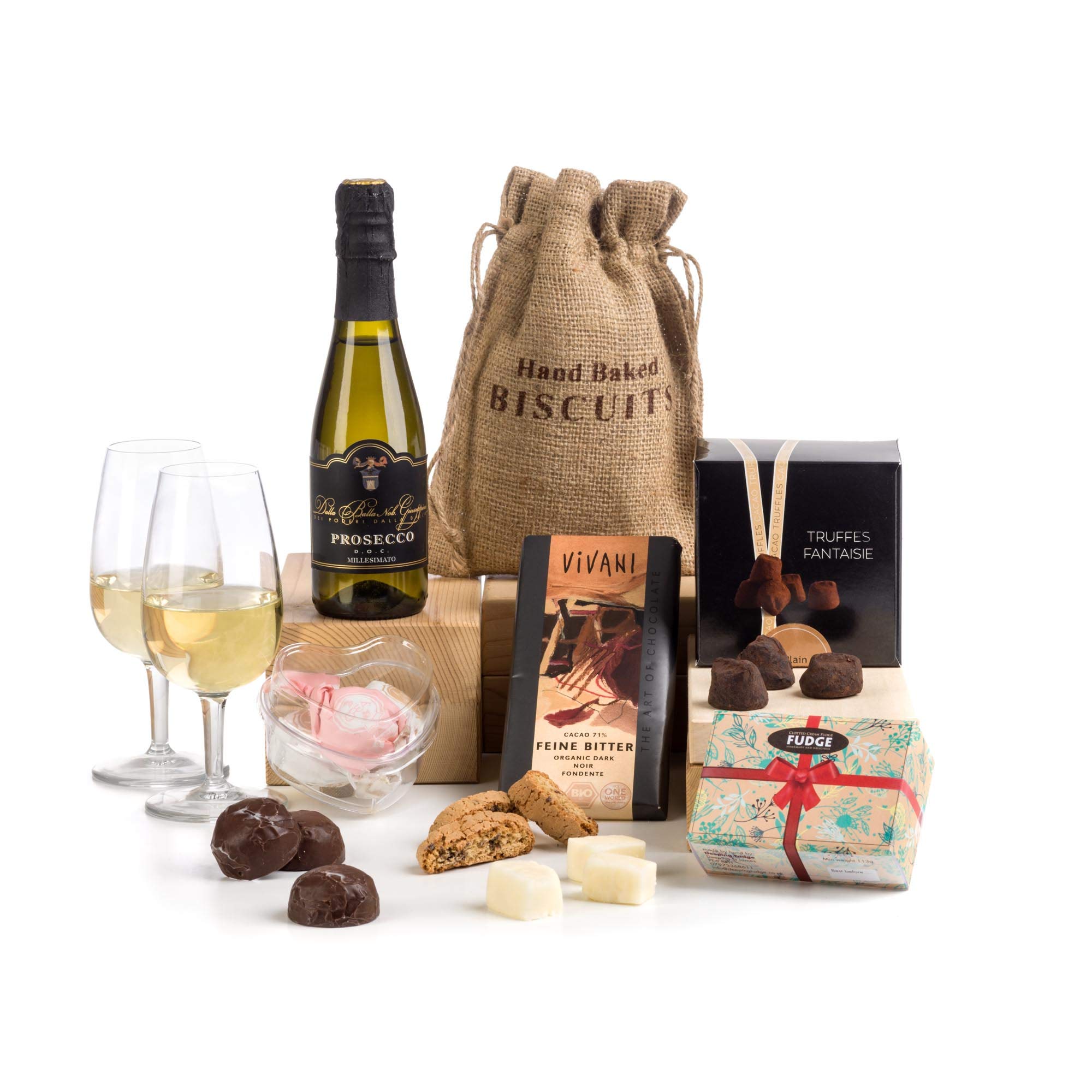A fun size bottle of Prosecco (ideal sipped from the bottle with a straw!) with a box of melt in the mouth, cocoa dusted French truffles, a bar of luxury organic 71% dark chocolate, some home made strawberry and clotted cream fudge in heart shaped pieces and a bag of artisan chocolate chip biscotti.