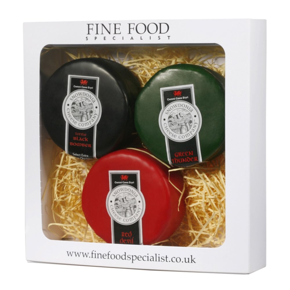 This gift box features a trio of excellent, wax-encased Snowdonia Cheddar truckles.