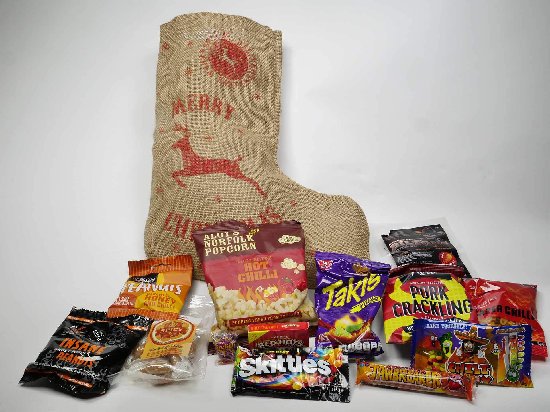 New from Right kind Hot Snacks just in time for Christmas! Let Santa treat the spice lover for your life to a big pre-packed Christmas stocking filled with spicy snacks and hot sweets. Enjoy quite a lot of heat levels and flavours, from jawbreakers and jelly beans to crisps, nuts and Biltong. Each and every stocking includes the next items: Reaper Chilli Bombay Mix, Carolina Reaper Biltong, Hot Chilli Popcorn, Hot To Trot Habanero Pork Crackling, Chili Candy Jelly Beans, Sweet Heat Skittles, Chilli Jawbreakers, Takis Fuego Chilli Lime Rolled Tortilla Chips, Caramelised Honey and Chilli Peanuts, Red Hots Fiery Cinnamon Candy, Atomic Fireball Jawbreaker, Chilli Chocolate Oranges, Insane Ghost Pepper Peanuts.