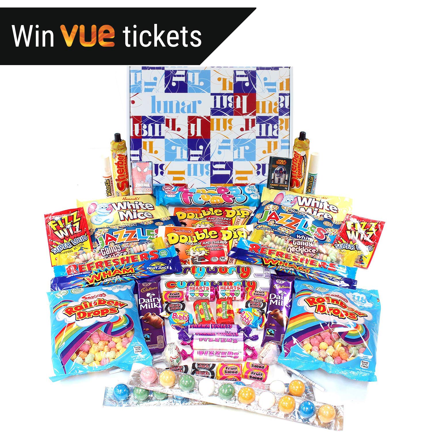 A Sweets & Chocolate hamper that’s perfect to share. Buy your Win free Vue tickets promotion hamper now. Will you be some of the 500 lucky winners? This jam-packed with candy makes this perfect inexpensive party treat. Our sweet hamper is the best gift idea for a Christmas (Xmas) present, a birthday gift for women and men, congratulations or a get better soon present, shop for boys or girls. Give someone a wonderful unique surprise with this special sweet hamper; they’re going to adore it. Great gift ideas; that will make the most difficult person to buy for smile, it’s a real lifesaver for those hard-to-buy-for people. Everyone of every age loves a sweet hamper. A novelty retro sweet box that is not only incredibly nostalgic – featuring loads of your childhood sweetshop favourites from the 70’s, 80’s and 90’s, but you get 2 of everything! The sweet hamper contains everything you see in the picture (on rare occasions we may have to swap an item in your retro sweet box, but rest assured it’ll be just as retro!). Please note: this retro sweet box contains sweets which may represent choking hazards and so the box is fallacious for children under 3 years of age. Buy your Win free Vue tickets promotion hampers now. Terms and Conditions for Vue Free Cinema Tickets: 1. Tickets can be used at 89 Vue locations nationwide excluding West End location (Leicester Square). 2. Tickets can be redeemed at Vue box office (not online) for admission to any 2D standard screening. 3.Tickets can be upgraded to IMAX, VIP, Recliner, Xtreme seating or Gold Class screenings at the Box Office upon payment of the difference. Upgrade to 3D is not conceivable. 4. Tickets are vaild till June 2019