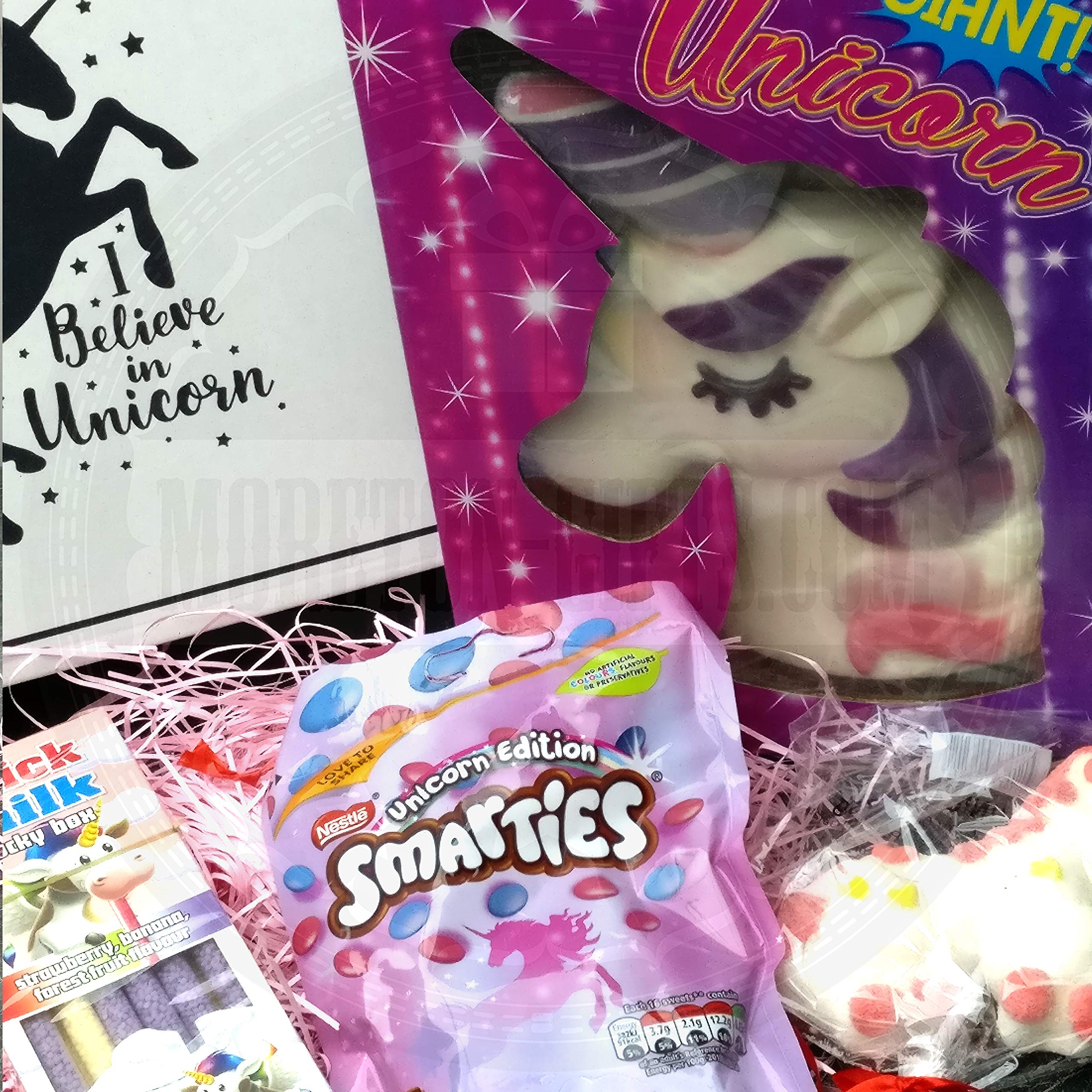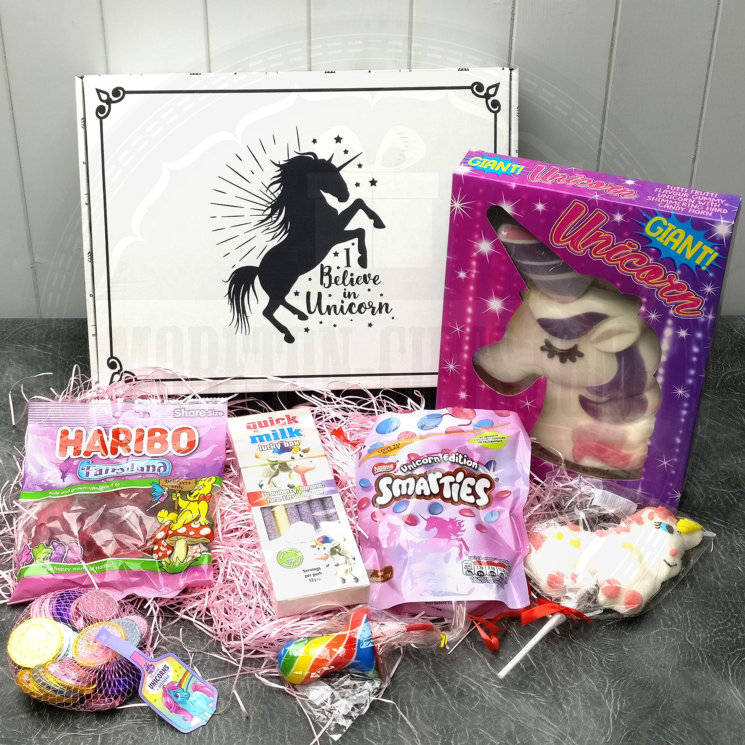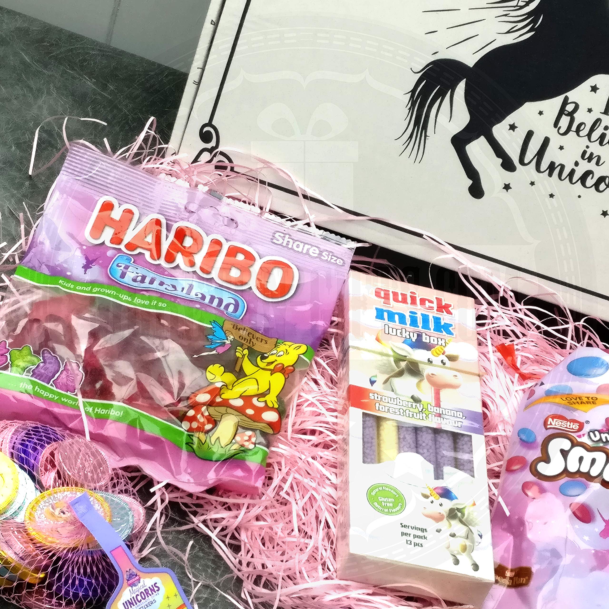 Comprises Large Unicorn Gummy Sweet, Haribo Fairyland Sweets, Unicorn Restricted Edition Smarties, Fast Milk Unicorn Straws, Unicorn Lolly, Unicorn Chocolate Coins, Dummy Lolly