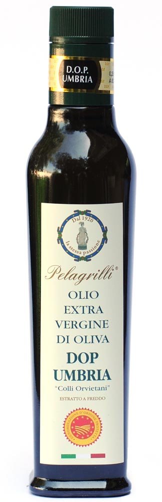 ORGANIC EXTRA VIRGIN OLIVE OIL FROM UMBRIA BY PELAGRILLI 250ml: Produced with Fine Local Variety Olives: “Frantoio”, “Moraiolo”, “Leccino” and “Dolce Agogia. The Olives are Harvested by Hand from Secular Trees Grown In line with Organic Farming and Pressed Within 12 Hours from Harvesting. The Extraction of Oil is made at Low Temperature, Slowly and Smoothly, Stress Free. D.O.P. Certfied (Secure Designation of Origin)