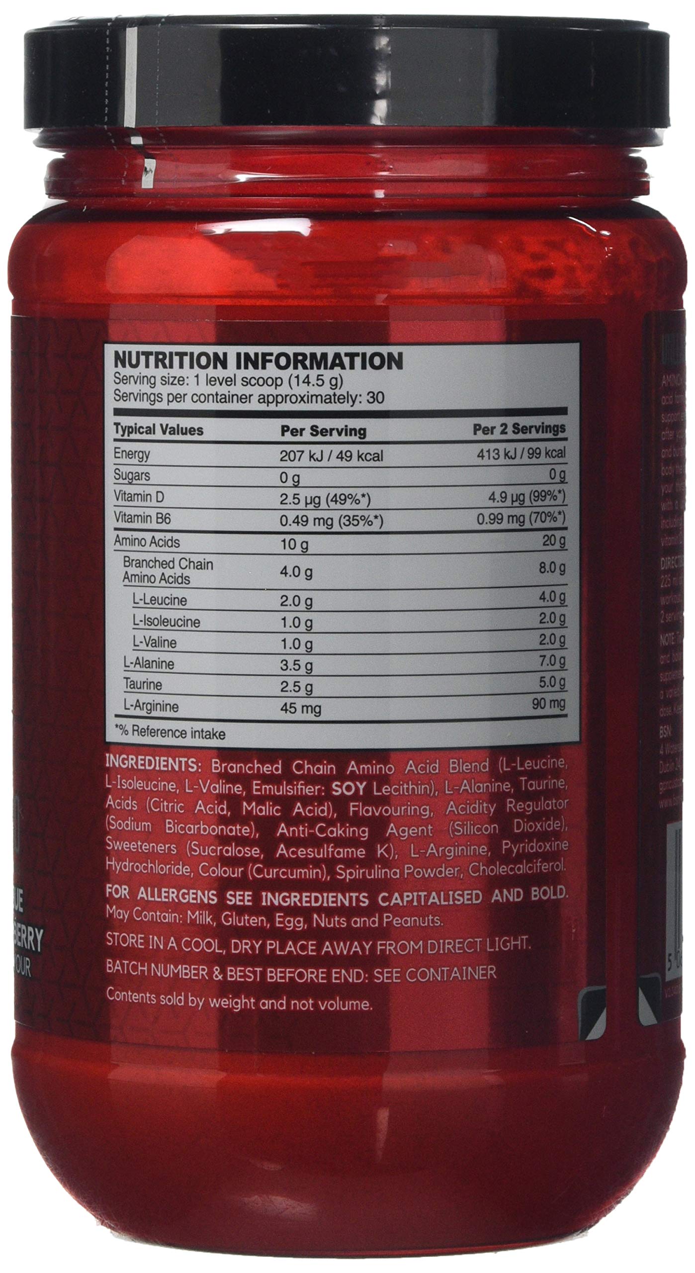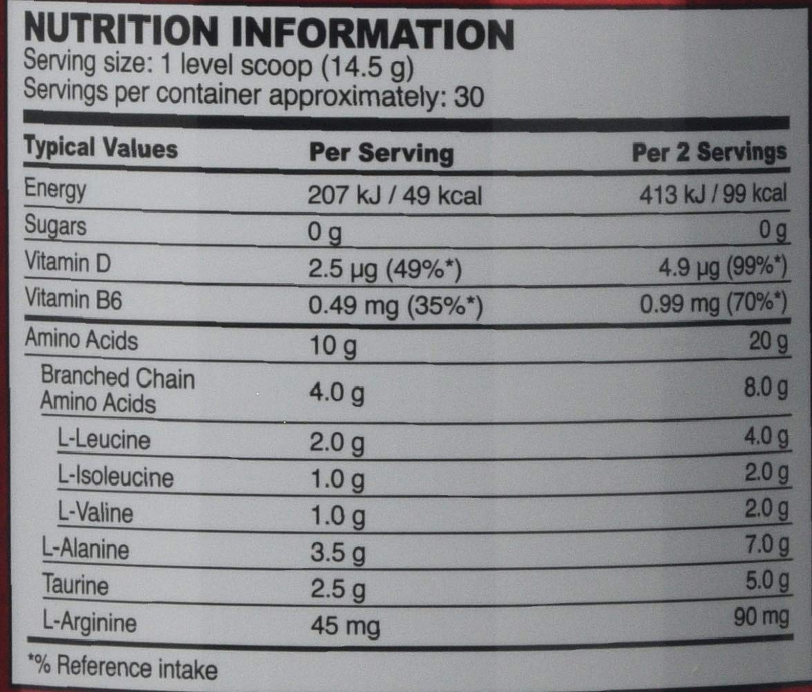 AMINO ACID BLEND – 10 g of amino acids per serving (includes 4 g of BCAAs in a 2:1:1 ratio of L-Leucine, L-Isoleucine and L-Valine).