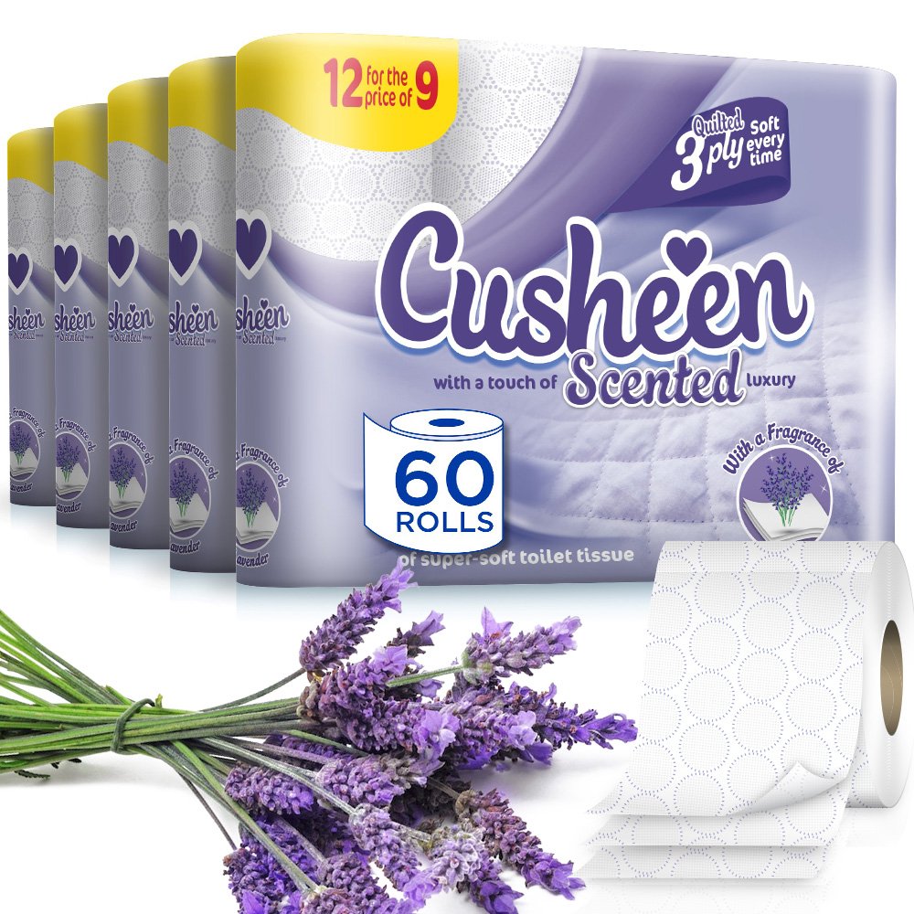 Cusheen Quilted Luxury Lavender Scented 3 Ply Toilet Tissue Paper Rolls – 60 Rolls