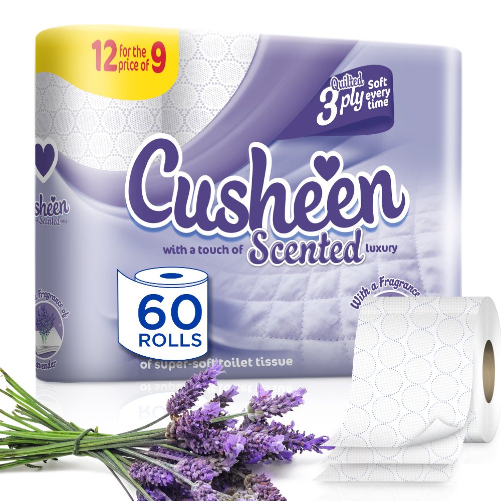 Cusheen 3 Ply Quilted Lavender Scented Rest room Tissue Rolls – Pack of 60 Rolls 60 rolls per pack (5 packs of 12 rolls) Quilted 3 ply Rest room paper rolls with a scent of lavender Approx. sheet size 105mm x 115mm Made in the United Kingdom with sustainably-sourced virgin fibre