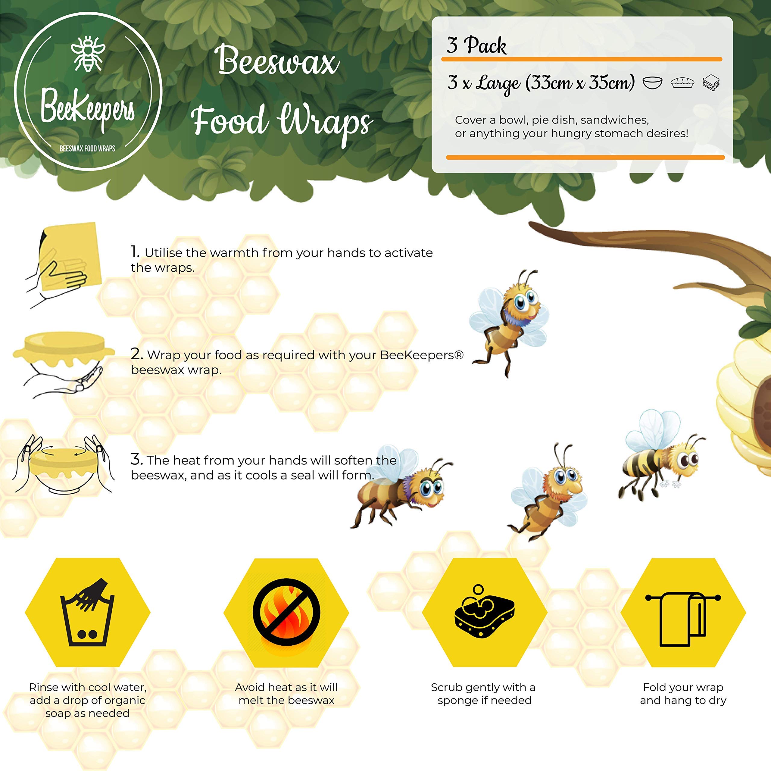 🥝 KEEP IT FRESH – With healthy and natural alternatives to cling film, paper bags, plastic wrapping and containers. Each pack contains three sheets [3x Large: 13″ x 14″]. Cover a large bowl pie dish some celery cheese a sandwich or anything your hungry stomach desires for lunch!