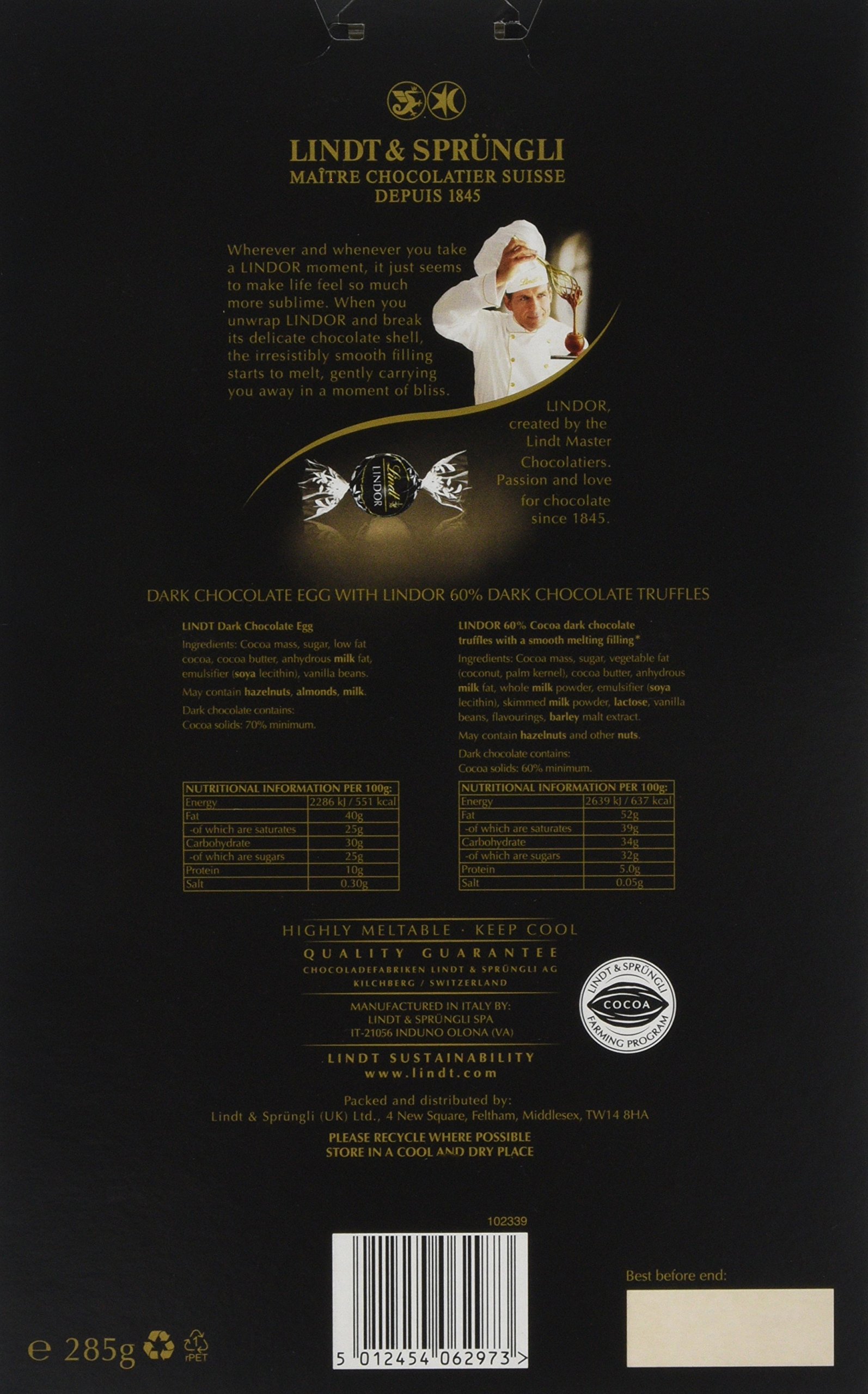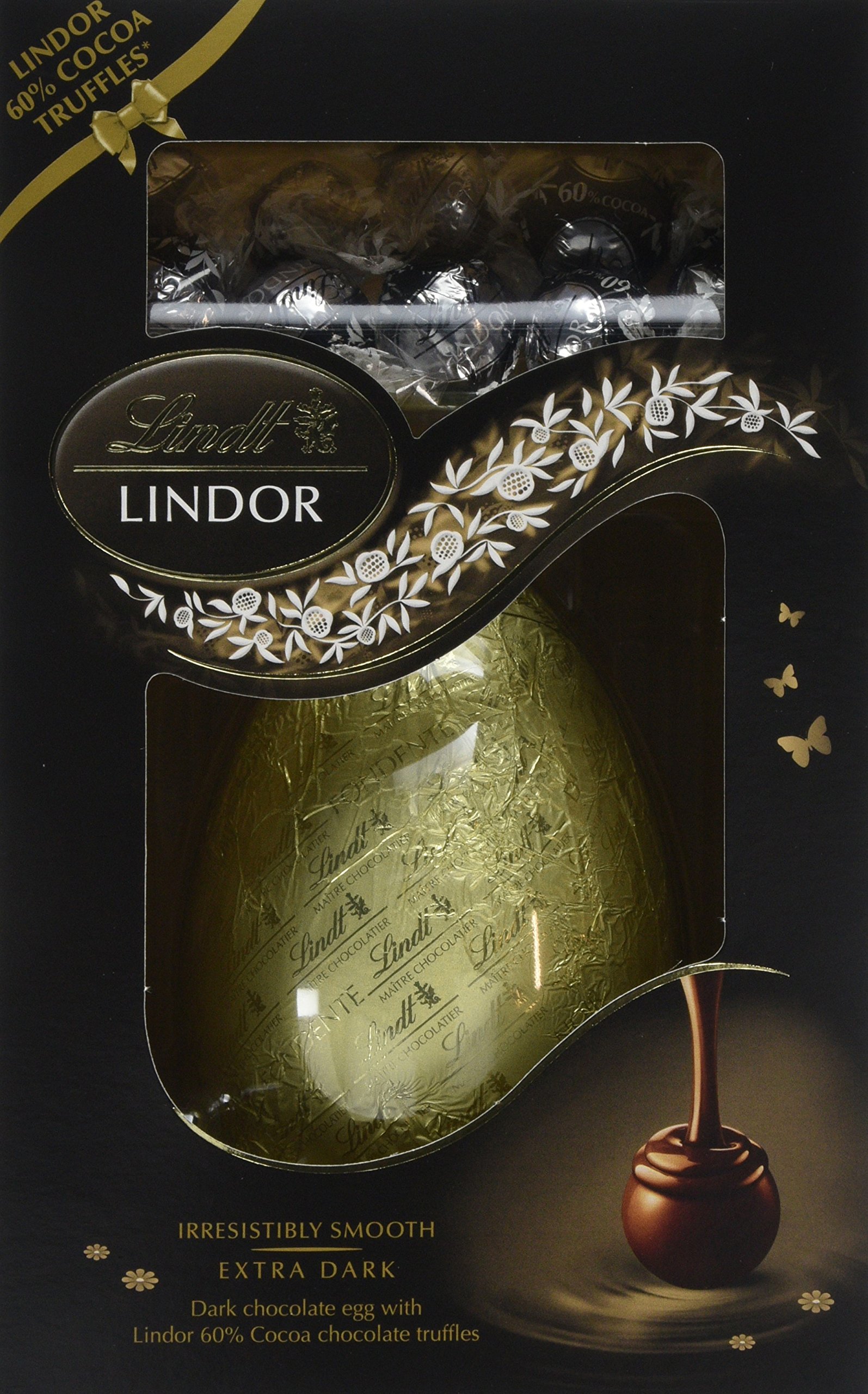 Accompanied by ten Lindor 60 Percent dark chocolate truffles that contain a smooth dark chocolate melting centre