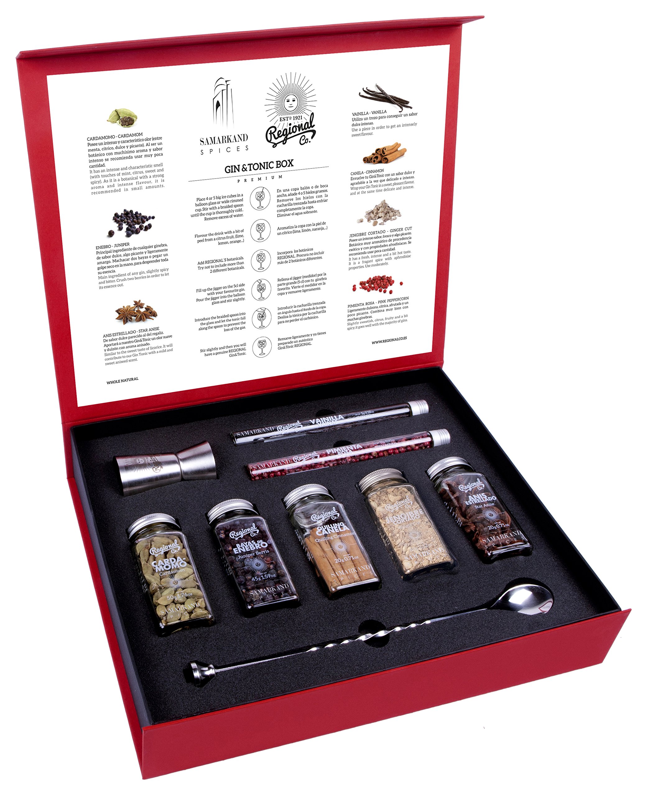 This Gin and Tonic premium box from Regional Co accommodates vanilla pods, pink pepper, quilling Ceylon cinnamon, cardamom, juniper berries, ginger cut and star anise, all decided on with assistance