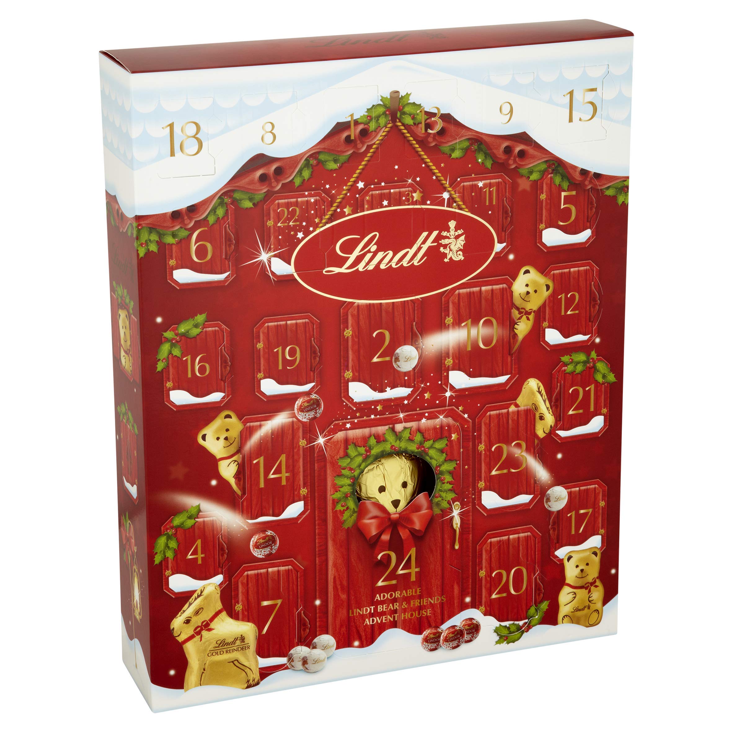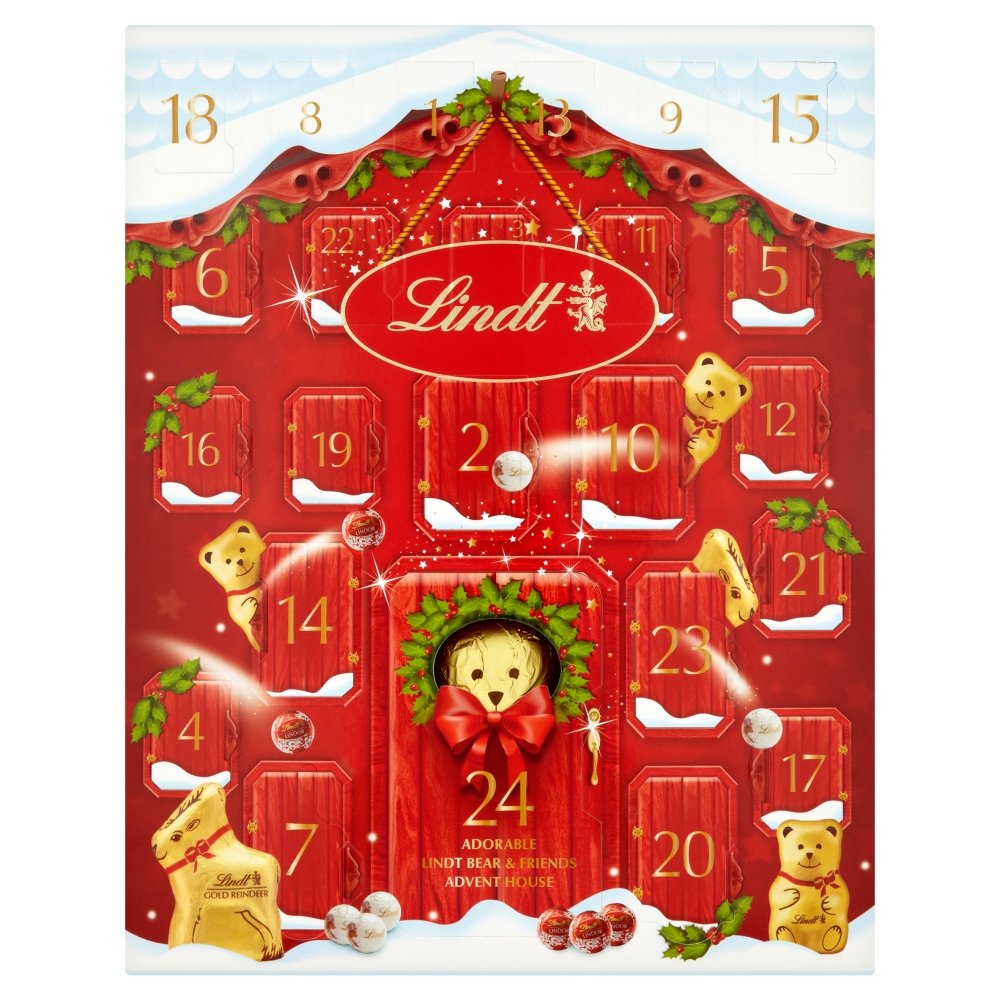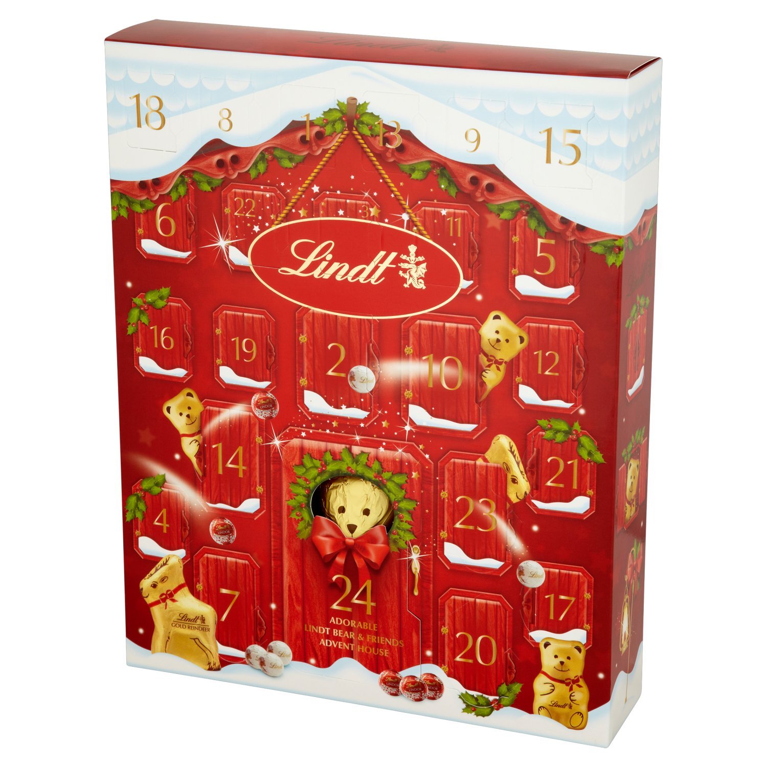 This adorable Bear calendar will fill you with anticipation: every window is stuffed with the thrills of Christmas as it accommodates 3 Bear 10g, 3 Gold Reindeer 10g, 6 Lindor mini truffles, 6 Snowballs and 5 Christmas Napolitans. What’s more, that is the one Advent Calendar to house a full size 100g chocolate shaped novelty in the back of door 24. Counting down to Christmas has never been so exciting!