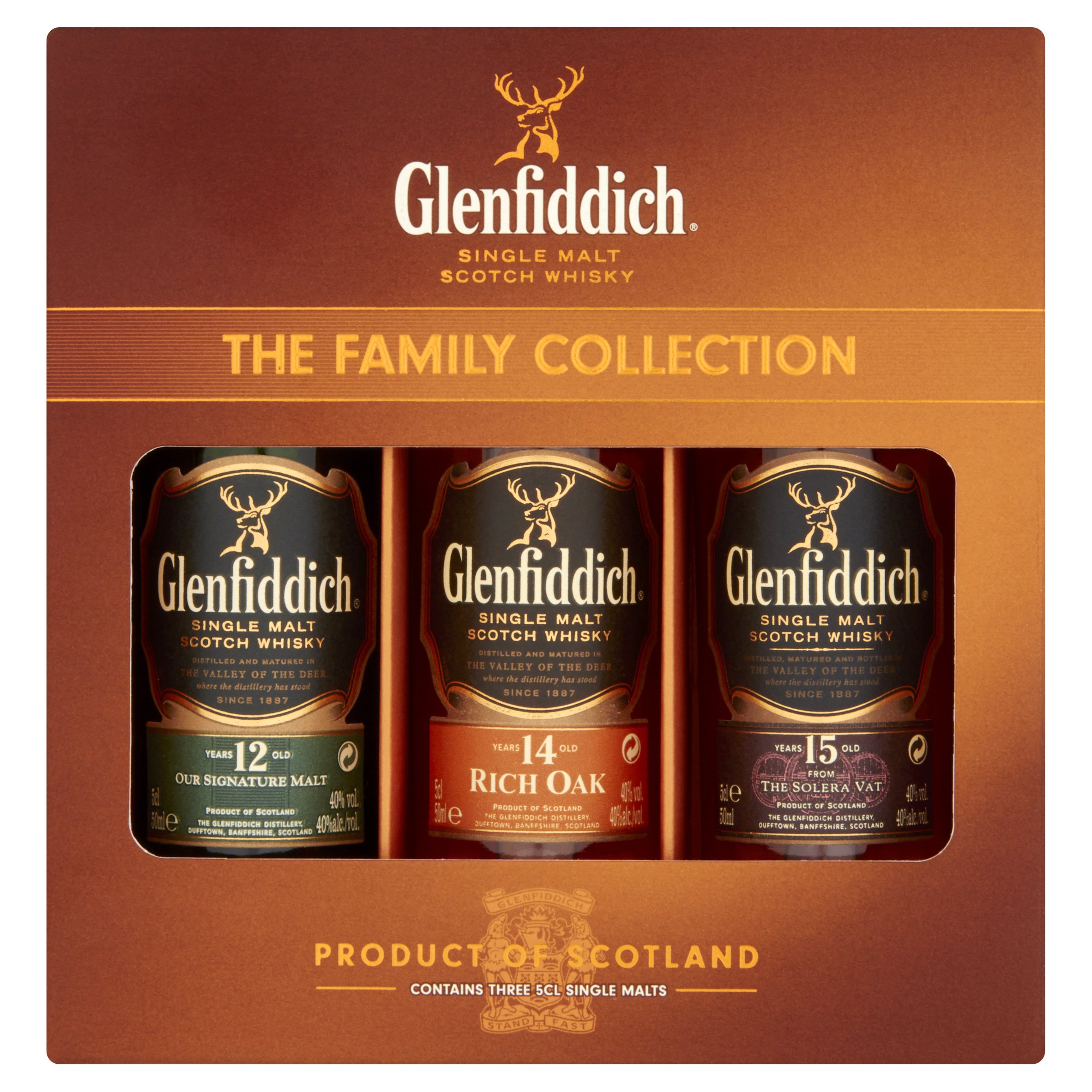 Includes 5cl bottle of Glenfiddich 12 Year Old, the award winning pioneer of single malt whisky.